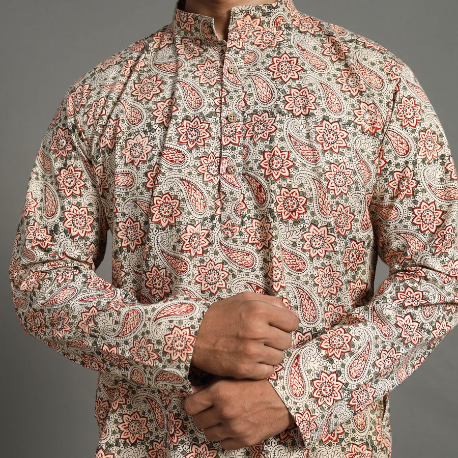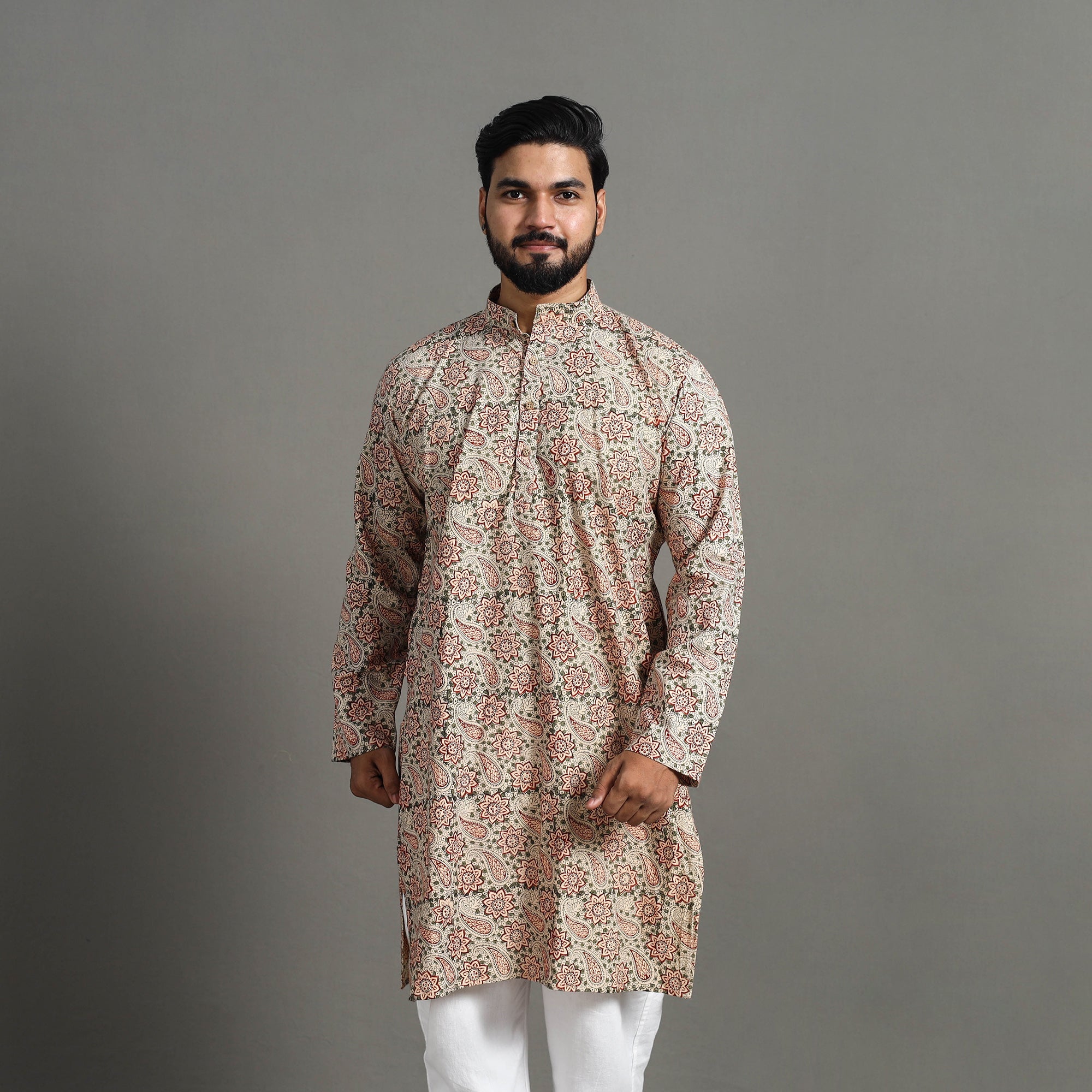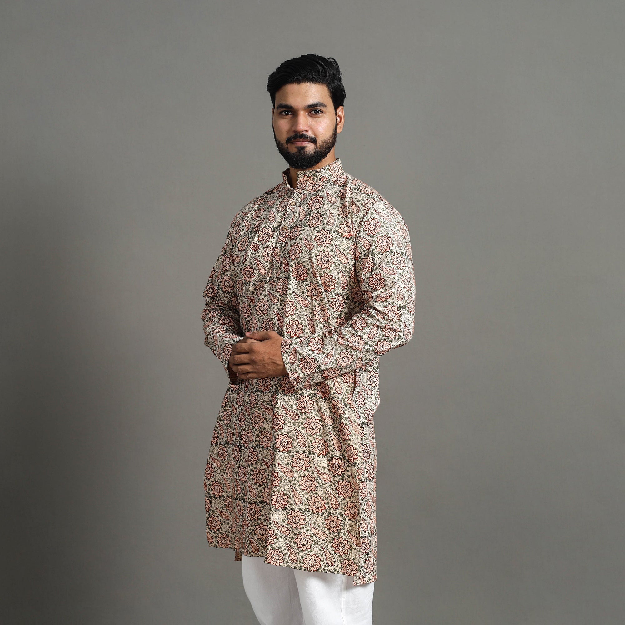 This traditional Kalamkari block printed cotton men's long kurta combines style and comfort seamlessly. Crafted with natural dyes through the age-old hand block kalamkari printing technique practiced by skilled artisans. the kurta features a Chinese collar, full sleeves, and crisp wooden buttons and convenient two side pocket, perfect for carrying small essentials.