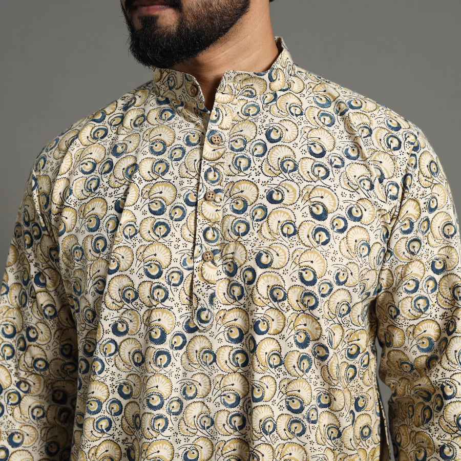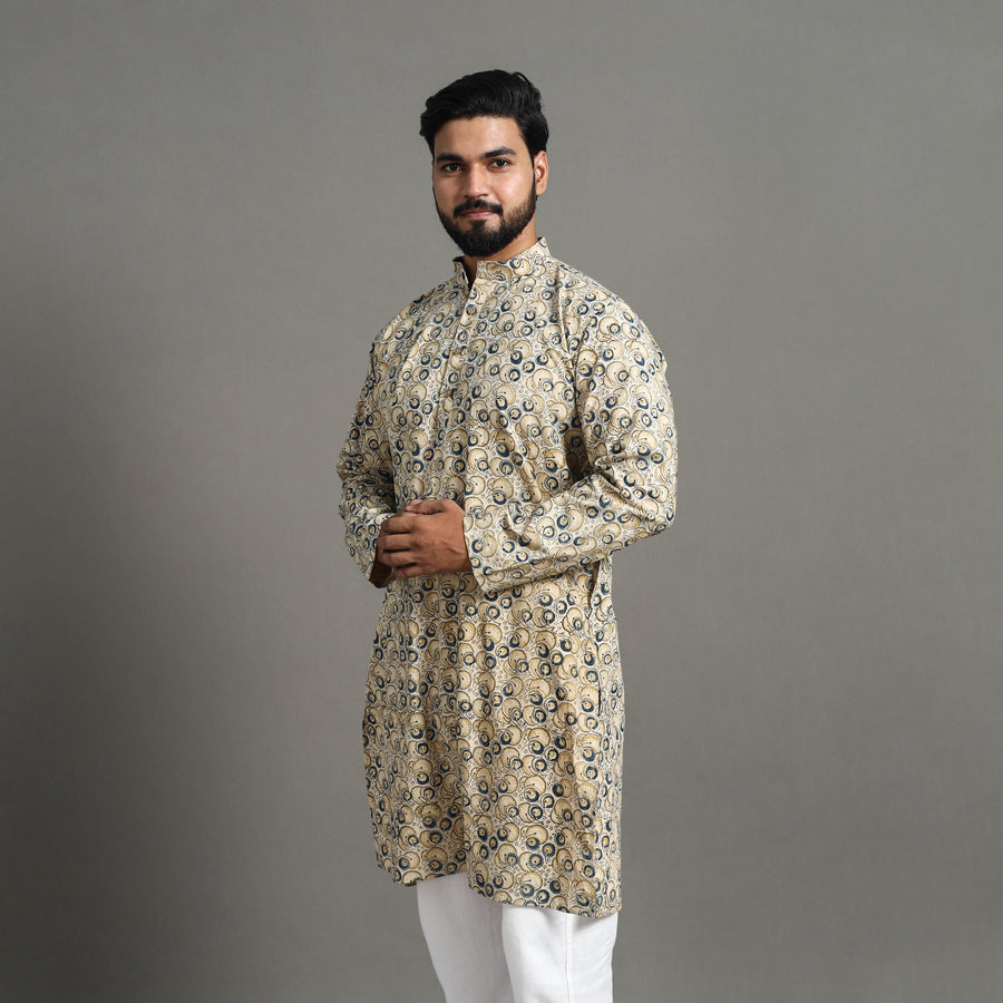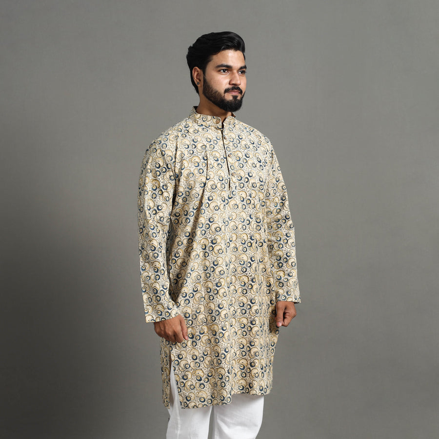 This traditional Kalamkari block printed cotton men's long kurta combines style and comfort seamlessly. Crafted with natural dyes through the age-old hand block kalamkari printing technique practiced by skilled artisans. the kurta features a Chinese collar, full sleeves, and crisp wooden buttons and convenient two side pocket, perfect for carrying small essentials.