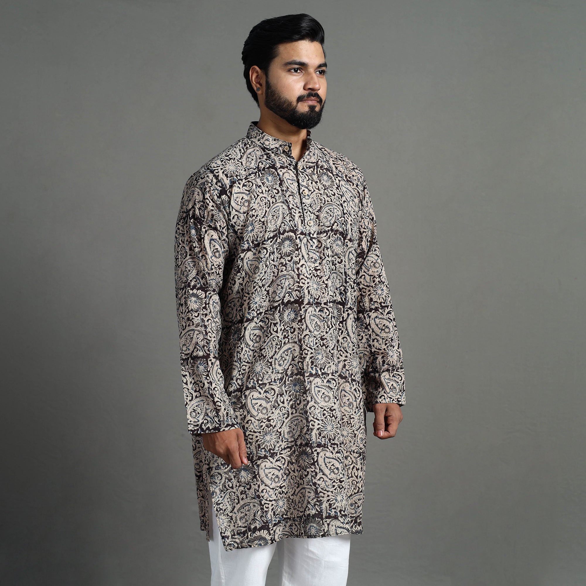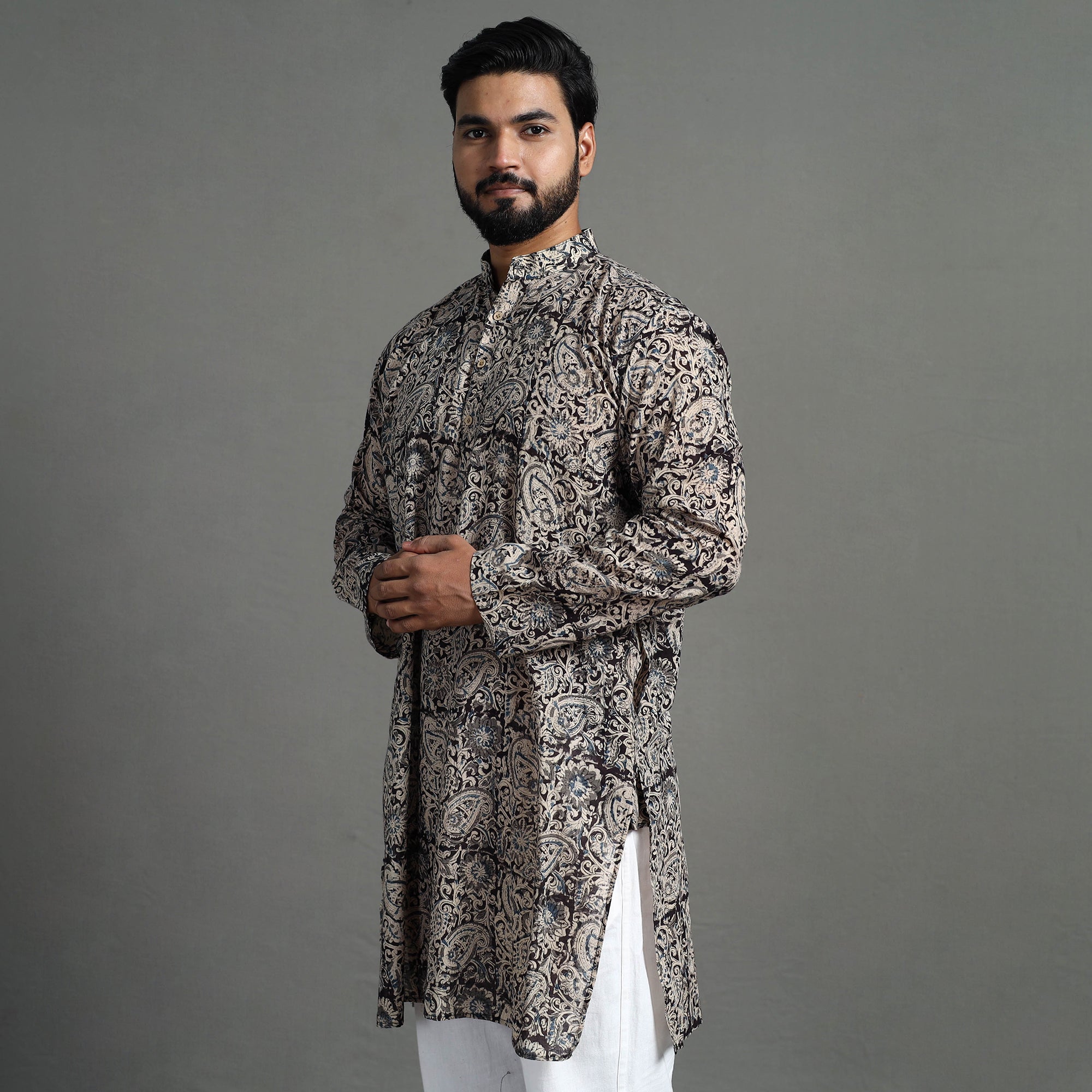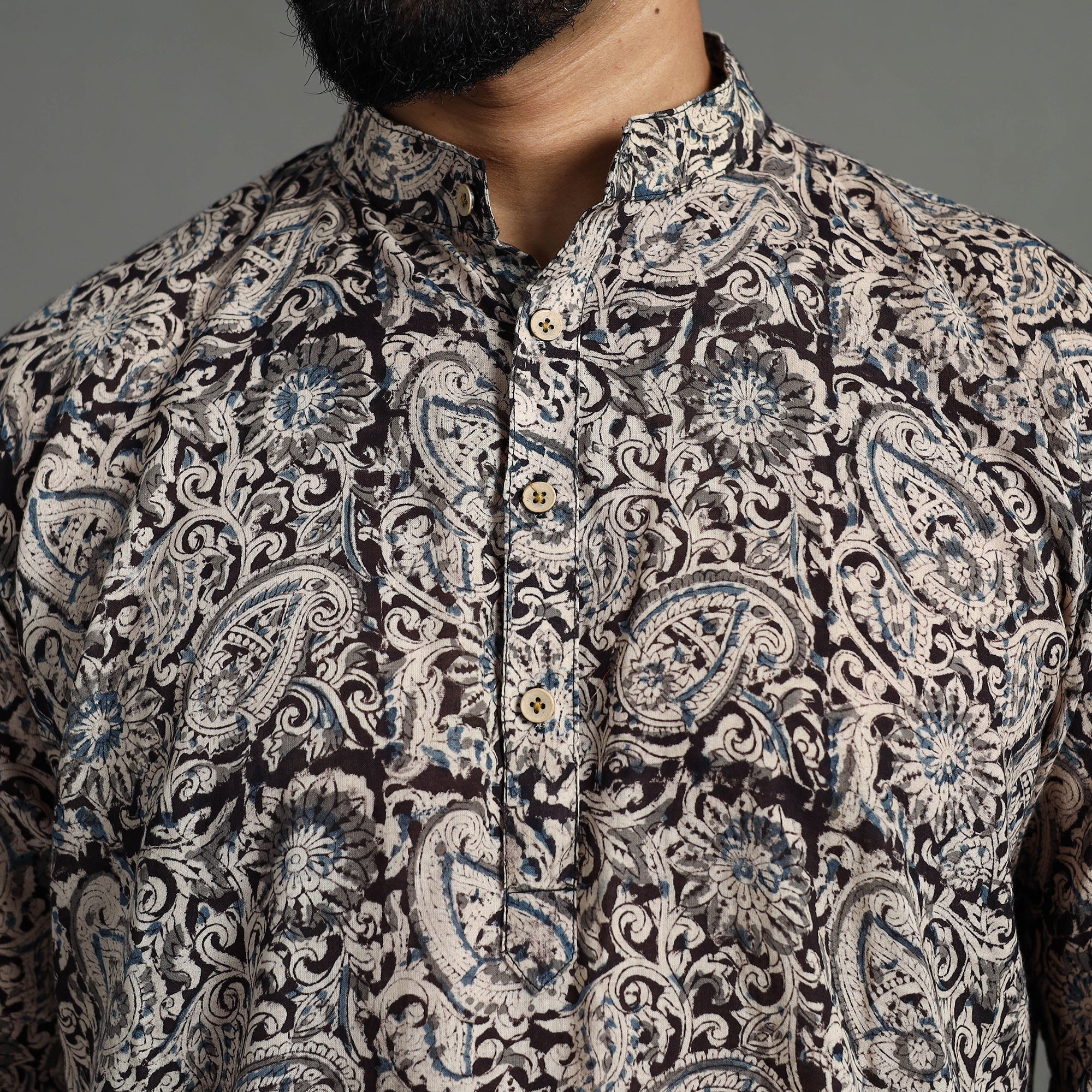 This traditional Kalamkari block printed cotton men's long kurta combines style and comfort seamlessly. Crafted with natural dyes through the age-old hand block kalamkari printing technique practiced by skilled artisans. the kurta features a Chinese collar, full sleeves, and crisp wooden buttons and convenient two side pocket, perfect for carrying small essentials.