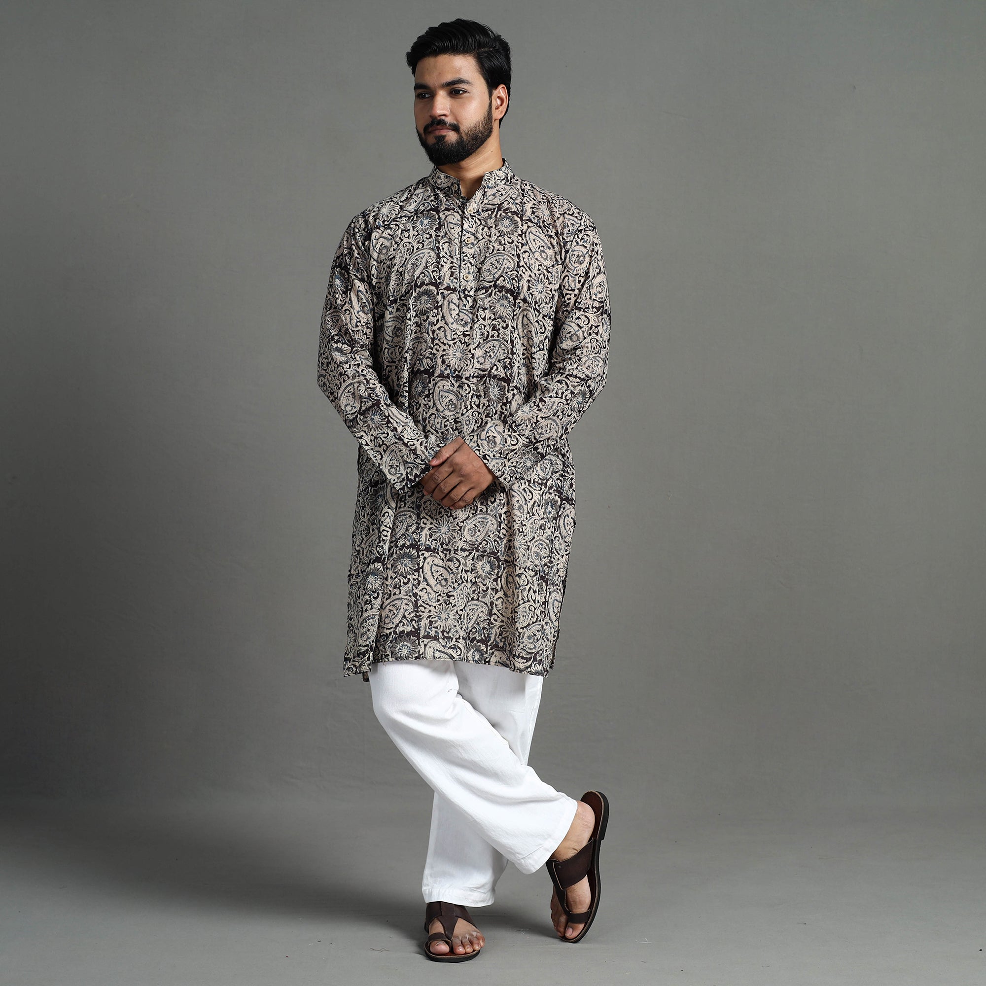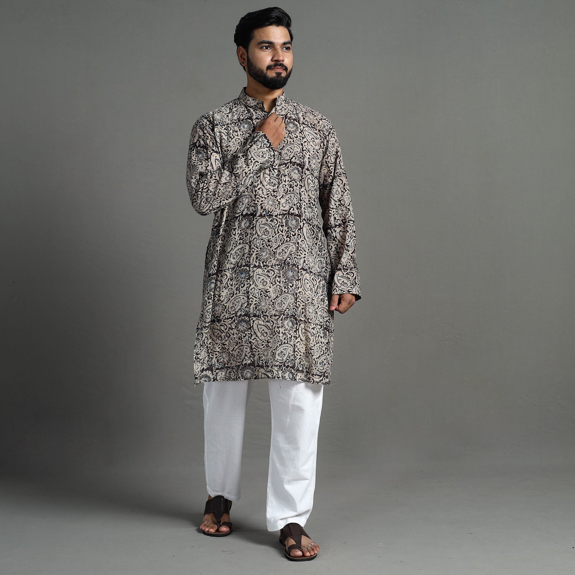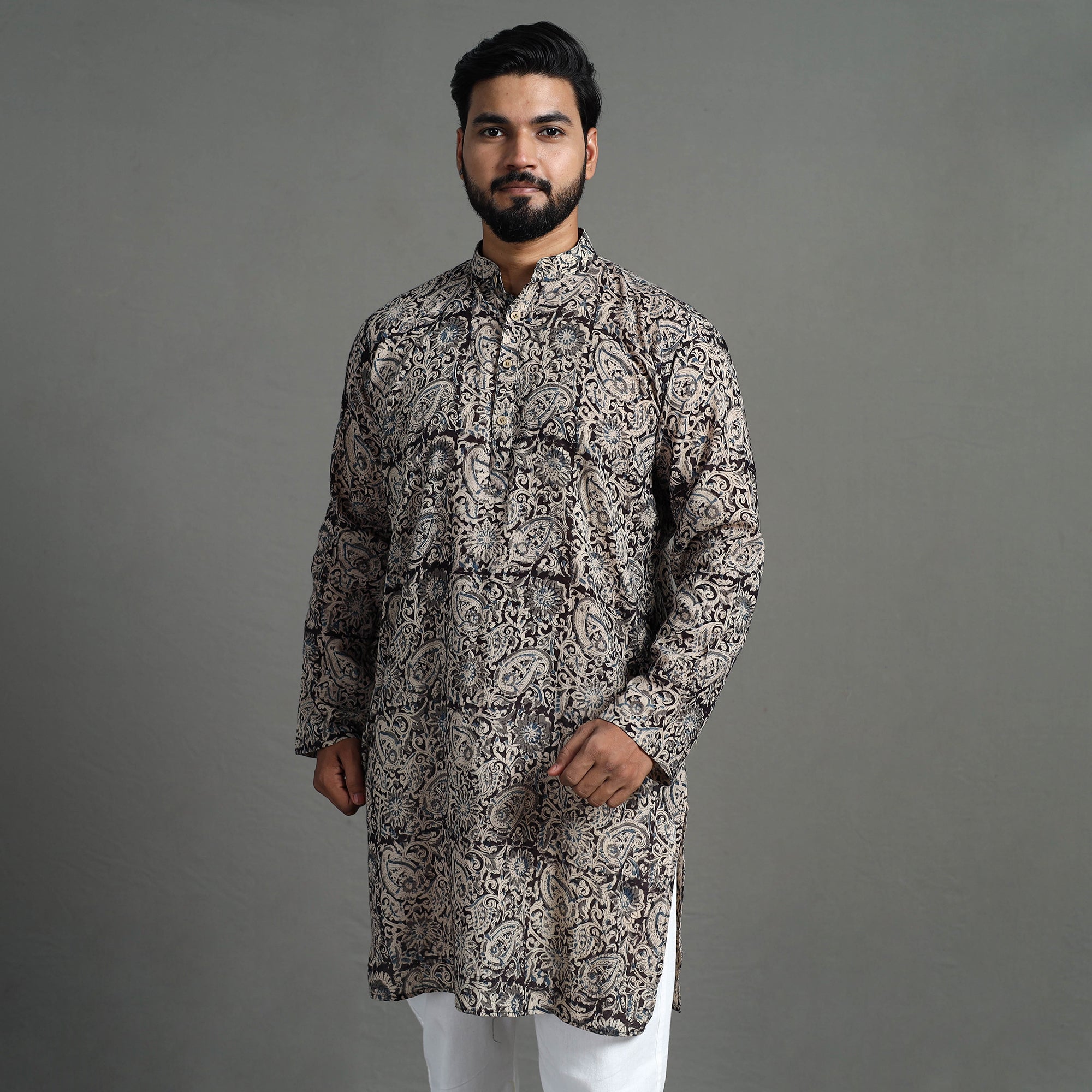 This traditional Kalamkari block printed cotton men's long kurta combines style and comfort seamlessly. Crafted with natural dyes through the age-old hand block kalamkari printing technique practiced by skilled artisans. the kurta features a Chinese collar, full sleeves, and crisp wooden buttons and convenient two side pocket, perfect for carrying small essentials.