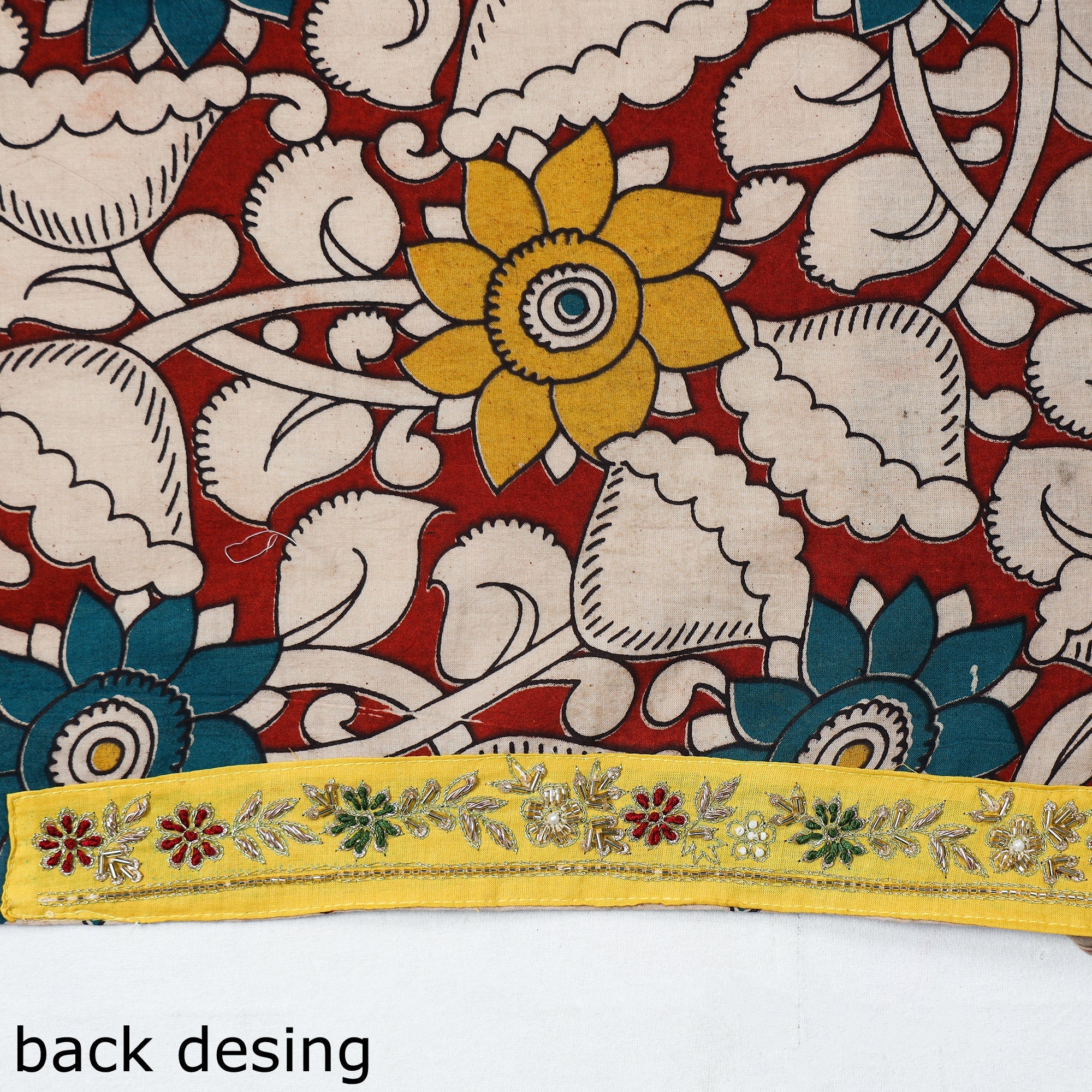 Fine-quality zardozi hand-embroidered kalamkari printed cotton blouse material made from cotton fabrics & textured with handmade textiles of India. This embroidered blouse material will go with almost all of your sarees & enhance your look.