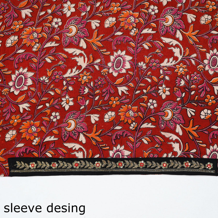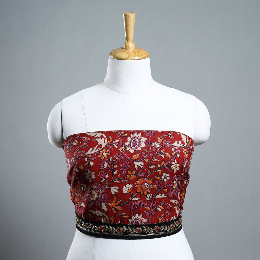 Fine-quality zardozi hand-embroidered kalamkari printed cotton blouse material made from cotton fabrics & textured with handmade textiles of India. This embroidered blouse material will go with almost all of your sarees & enhance your look.