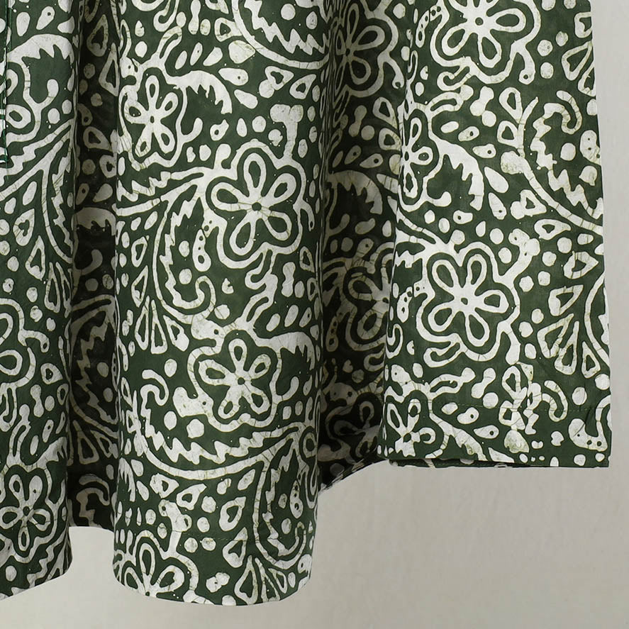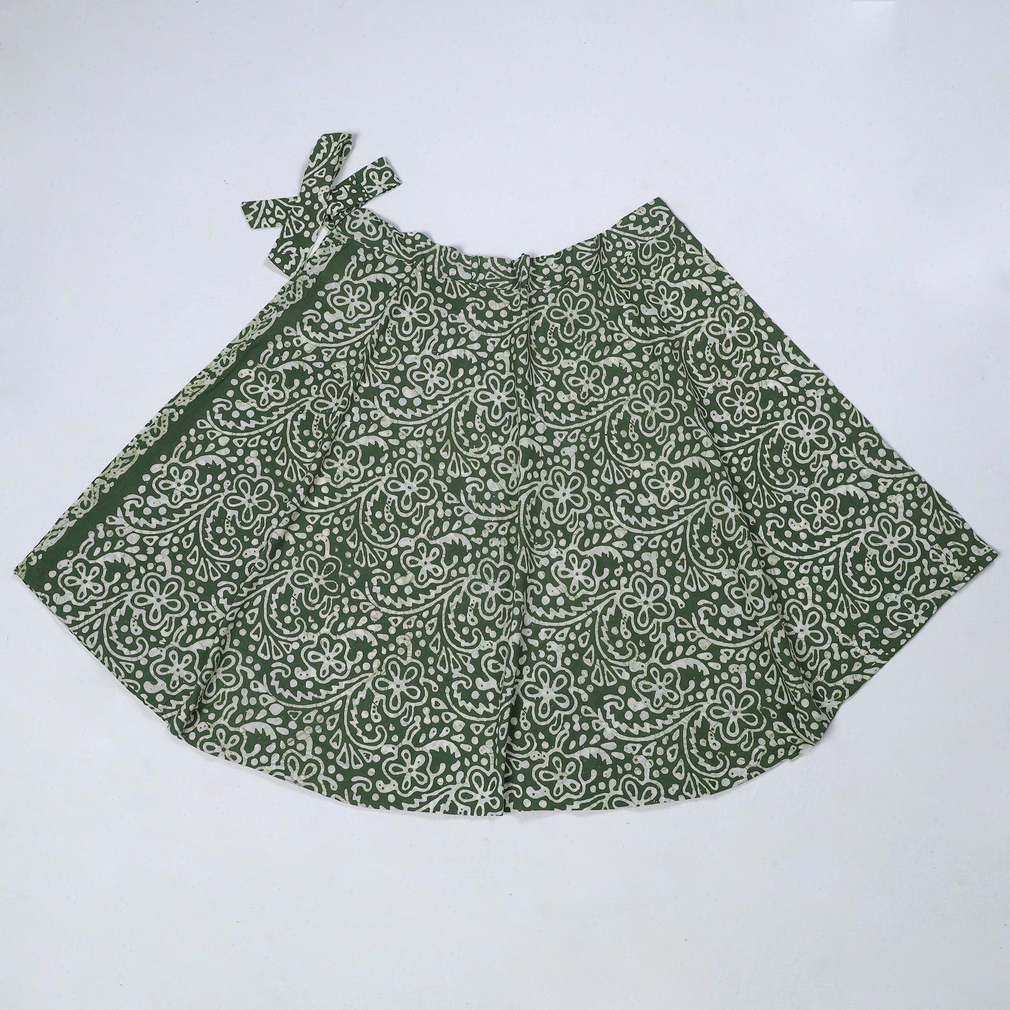 Fine-quality green hand batik printed cotton wrap around skirt featuring a waist tie up closure. Batik is a technique of wax-resist dyeing applied to whole cloth, or cloth made using this technique. Perfect for casual outings or special occasions, this skirt exudes elegance and comfort.