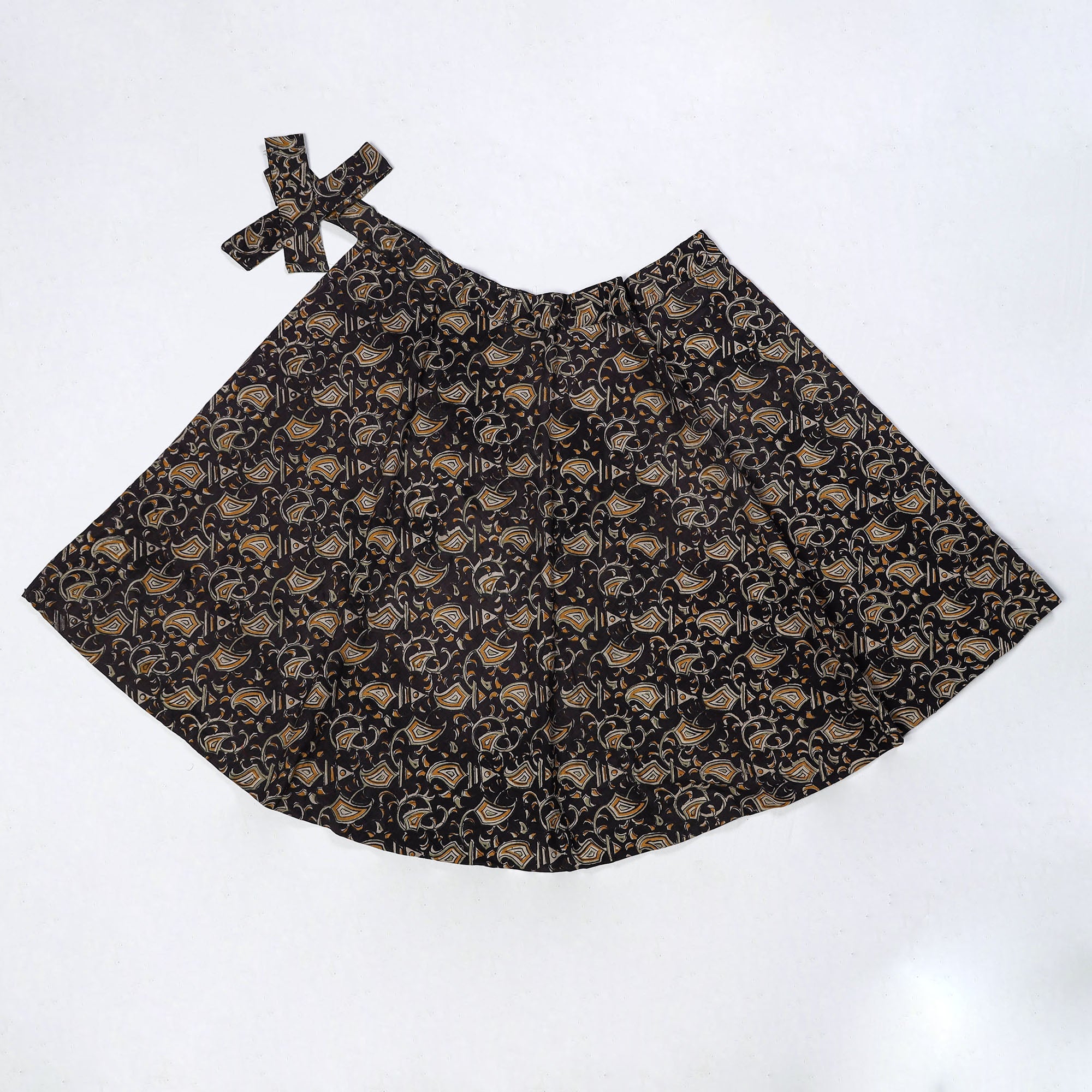 This kalamkari block-printed cotton wrap-around skirt seamlessly blends tradition with contemporary fashion. The waist tie-up closure ensures a customized fit, while the intricate Kalamkari craft adds a touch of artistry. Perfect for casual outings or special occasions, this skirt exudes elegance and comfort.