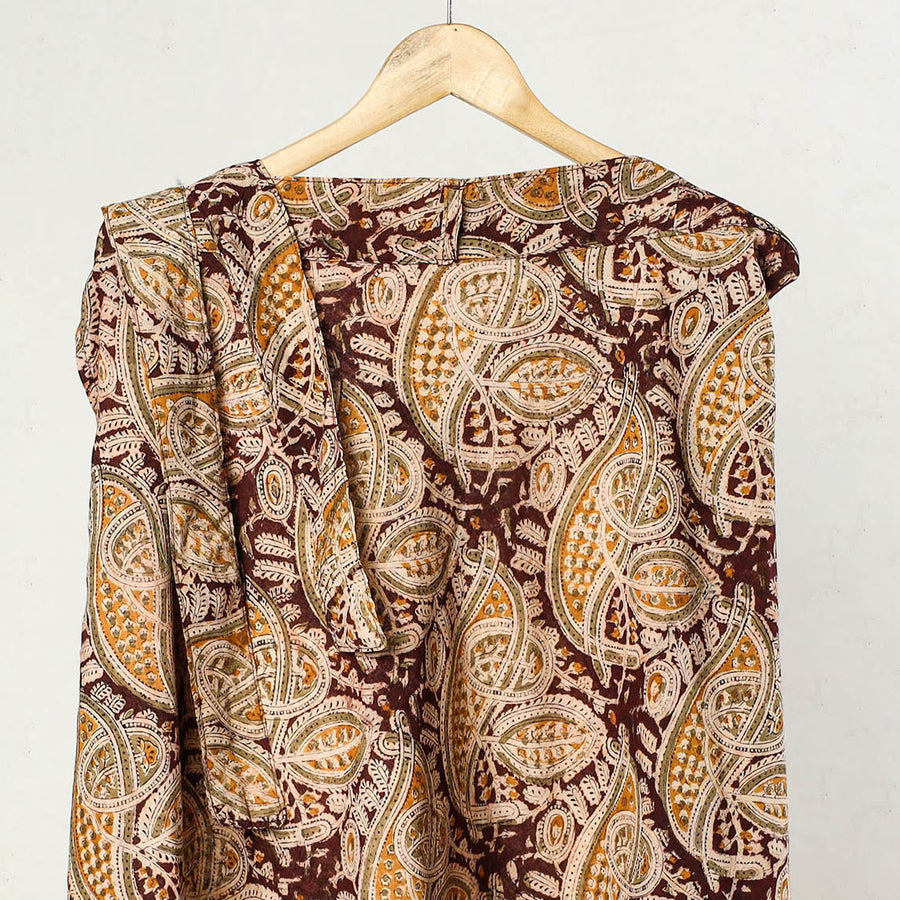 This kalamkari block-printed cotton wrap-around skirt seamlessly blends tradition with contemporary fashion. The waist tie-up closure ensures a customized fit, while the intricate Kalamkari craft adds a touch of artistry. Perfect for casual outings or special occasions, this skirt exudes elegance and comfort.