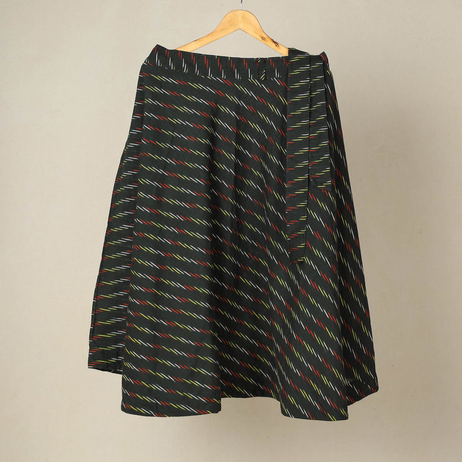 Elevate your style with this green pochampally ikat weave cotton wrap around skirt. Featuring a waist tie-up closure, this skirt is stylish and comfortable to wear. The ikat (ikkat) dyeing technique used in this skirt creates beautiful patterns and designs, making it a standout piece in your wardrobe.
