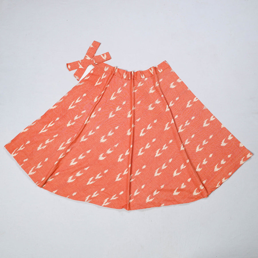 Elevate your style with this orange pochampally ikat weave cotton wrap around skirt. Featuring a waist tie-up closure, this skirt is stylish and comfortable to wear. The ikat (ikkat) dyeing technique used in this skirt creates beautiful patterns and designs, making it a standout piece in your wardrobe.