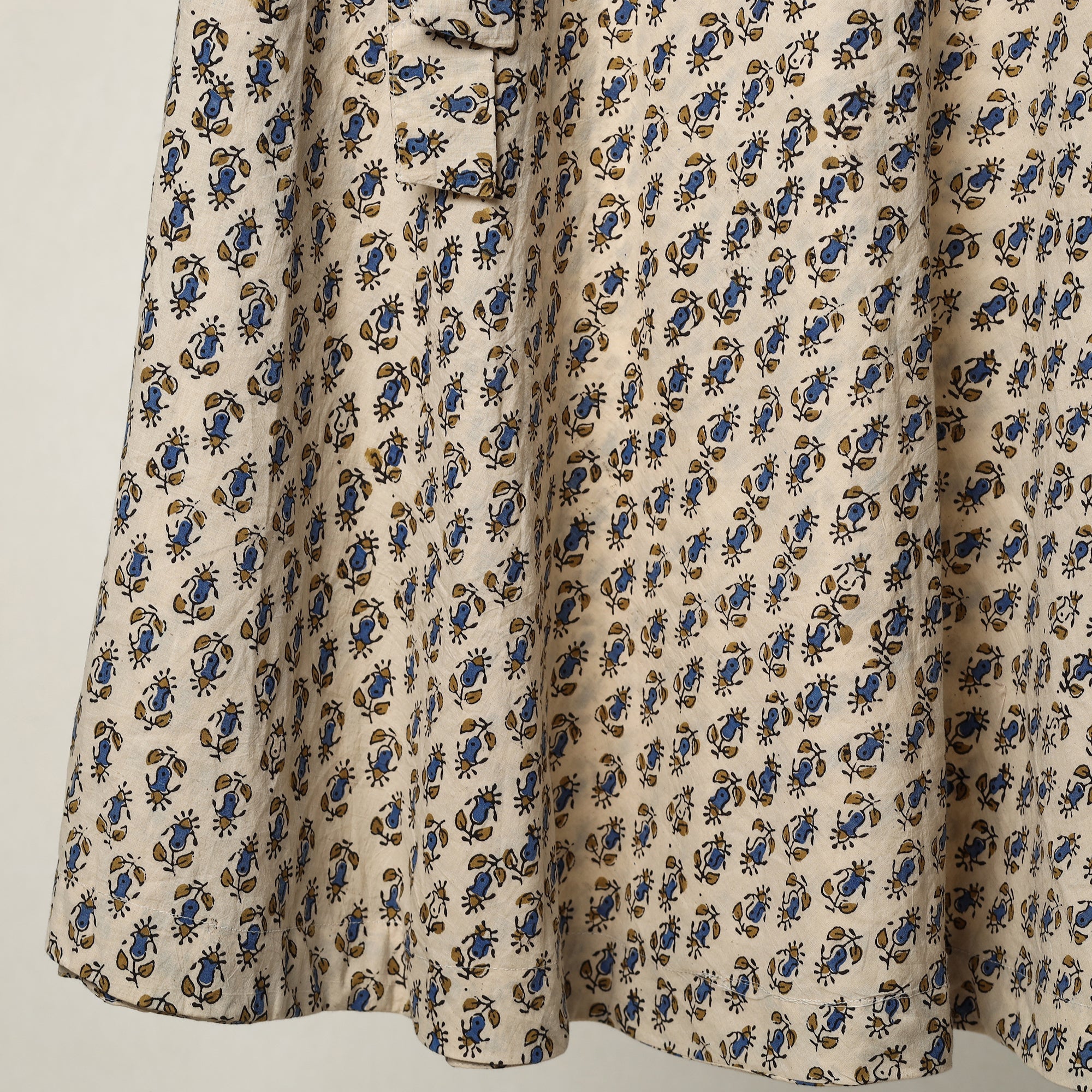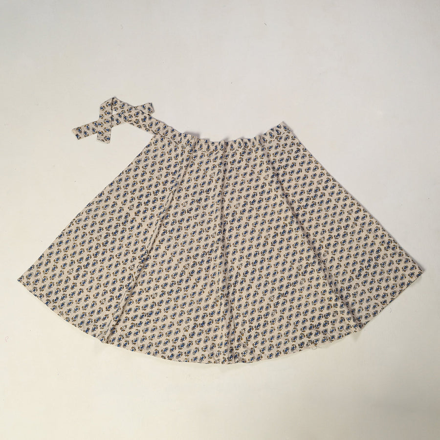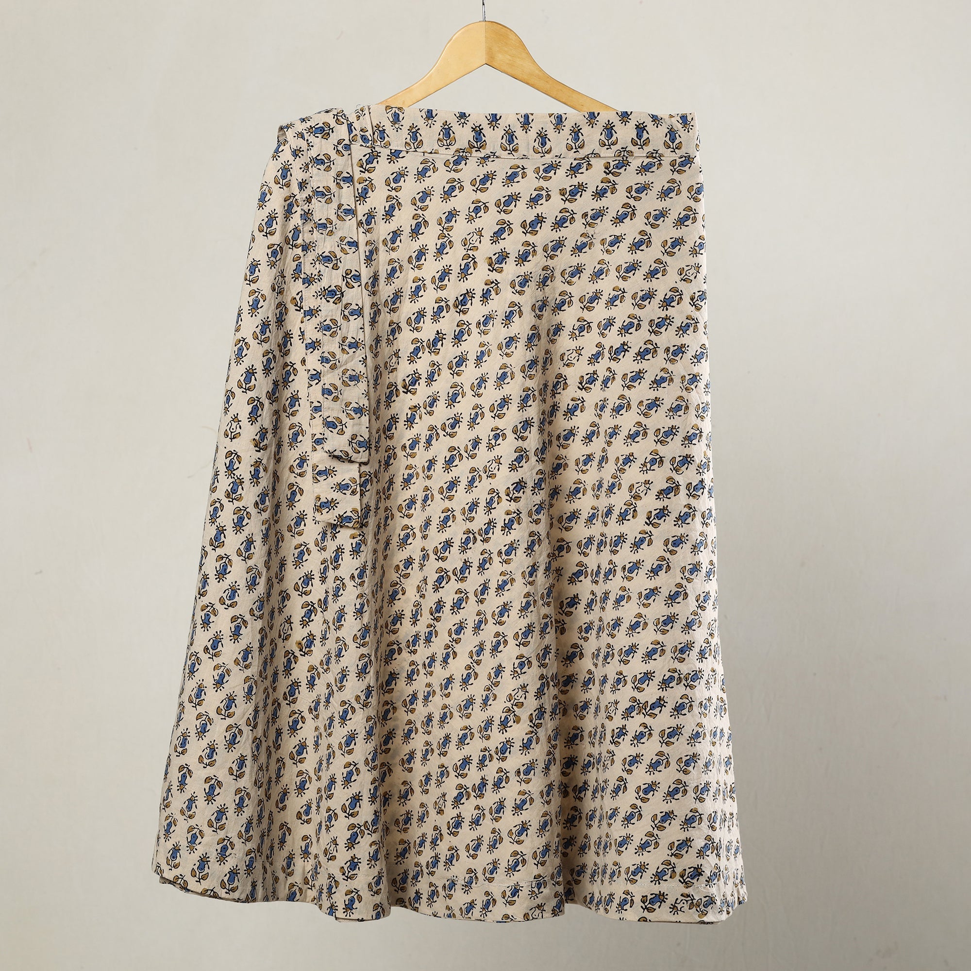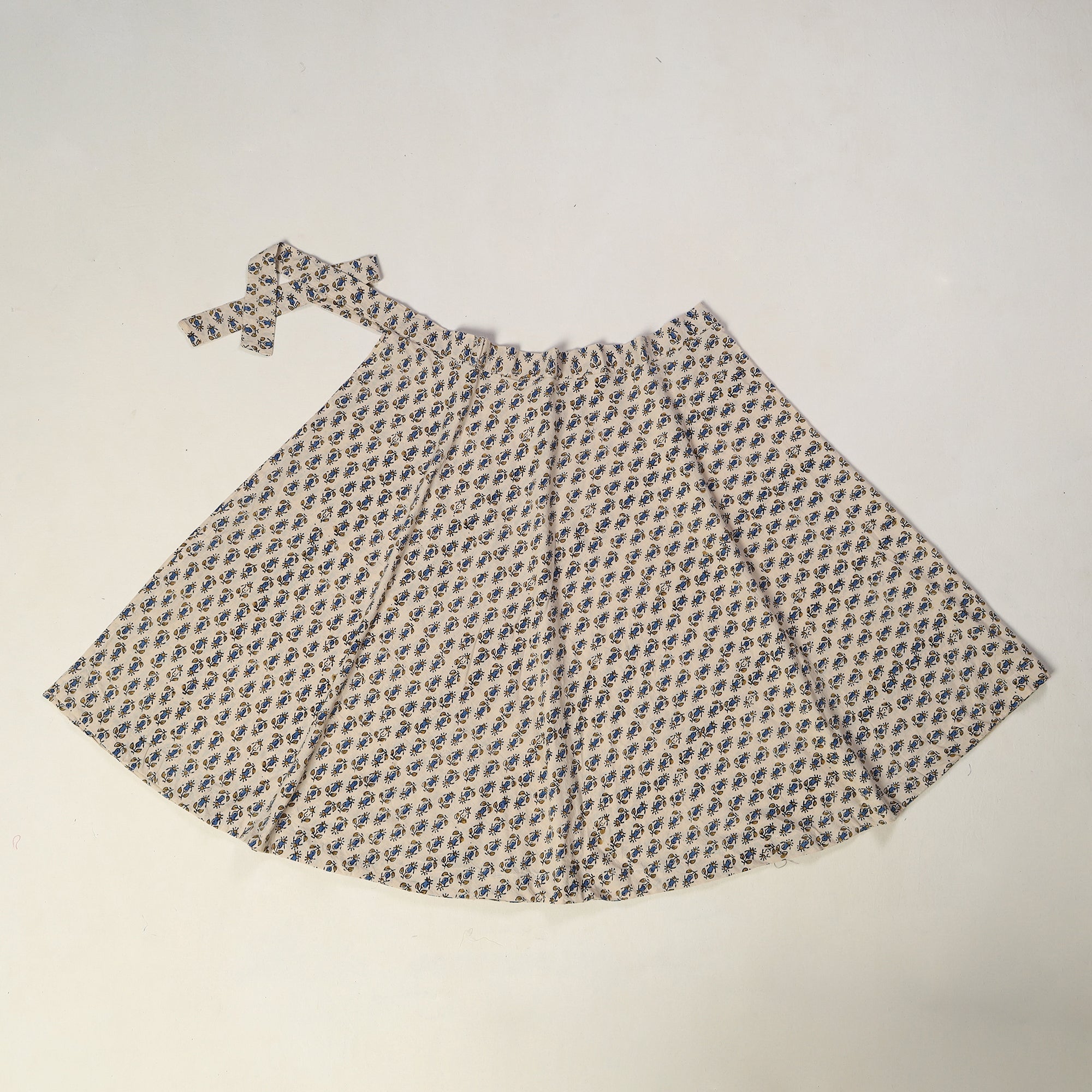 Fine-quality beige ajrakh hand-block-printed cotton wrap around skirt featuring a waist tie-up closure, made using natural dyes through the traditional ajrakh technique of hand-block printing practiced by the master artisans in the Kutch region of Gujarat.
