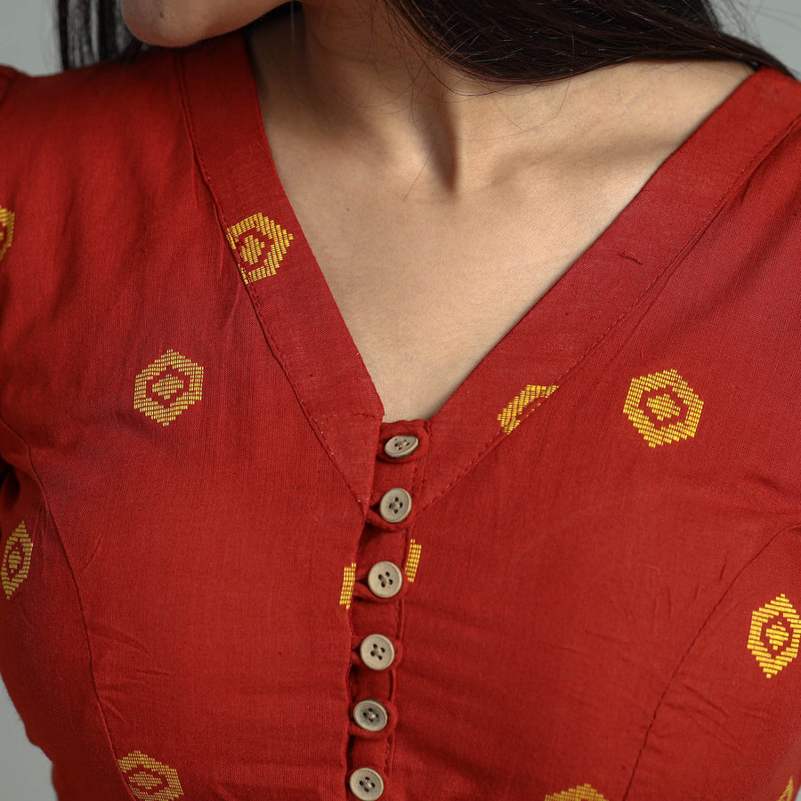 This jacquard weave cotton blouse is seamlessly stitched with padded comfort for a relaxed fit. Crafted from cotton fabric known for its breathability and comfort, it features half sleeves that provide balanced coverage, making it perfect for any occasion. It is adorned with wooden button locks, adding a natural and rustic element to the design. This piece carries tiny knots, thread pulls, or uneven lines — not flaws, but fingerprints. Every irregularity is a whisper from the hands that made it. It’s what happens when tradition weaves through time, not machines. If you’re looking for perfection, this isn’t it. But if you’re looking for soul — you’ve found it.