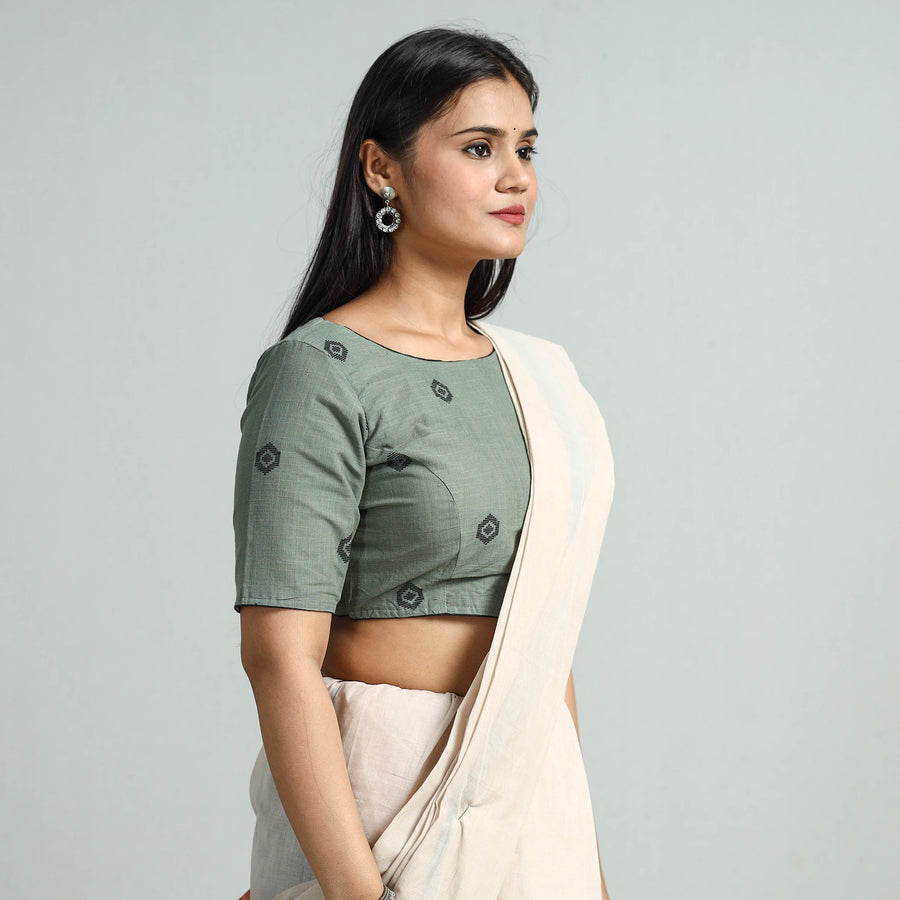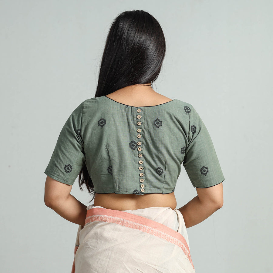 This jacquard-weave cotton blouse is seamlessly stitched with padded comfort for a relaxed fit. Crafted from cotton fabric known for its breathability and comfort. It features a side zipper lock and half sleeves that provide balanced coverage, making it perfect for any occasion. It is adorned with wooden buttons, adding a natural and rustic element to the design.