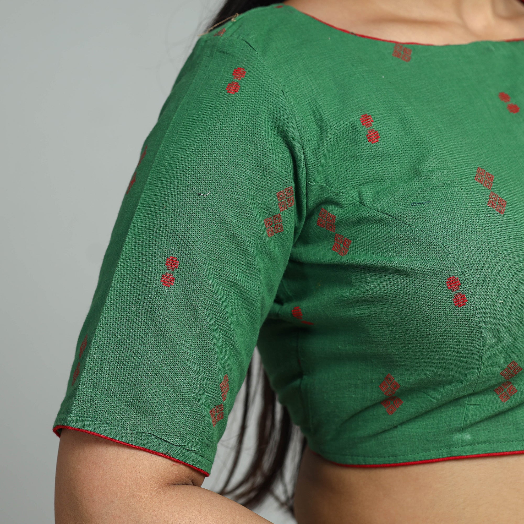 This jacquard-weave cotton blouse is seamlessly stitched with padded comfort for a relaxed fit. Crafted from cotton fabric known for its breathability and comfort. It features a side zipper lock and half sleeves that provide balanced coverage, making it perfect for any occasion. It is adorned with wooden buttons, adding a natural and rustic element to the design.