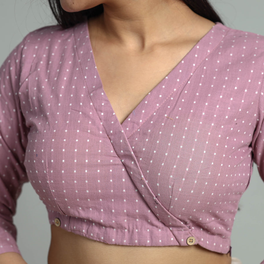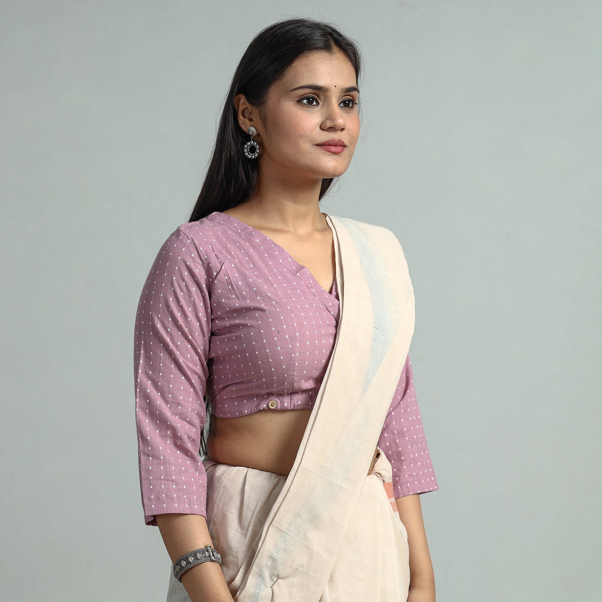This pink jacquard-weave cotton blouse is seamlessly stitched with padded comfort for a relaxed fit. Crafted from cotton fabric known for its breathability and comfort. It features a side zipper lock and 3/4 sleeves that provide balanced coverage, making it perfect for any occasion.