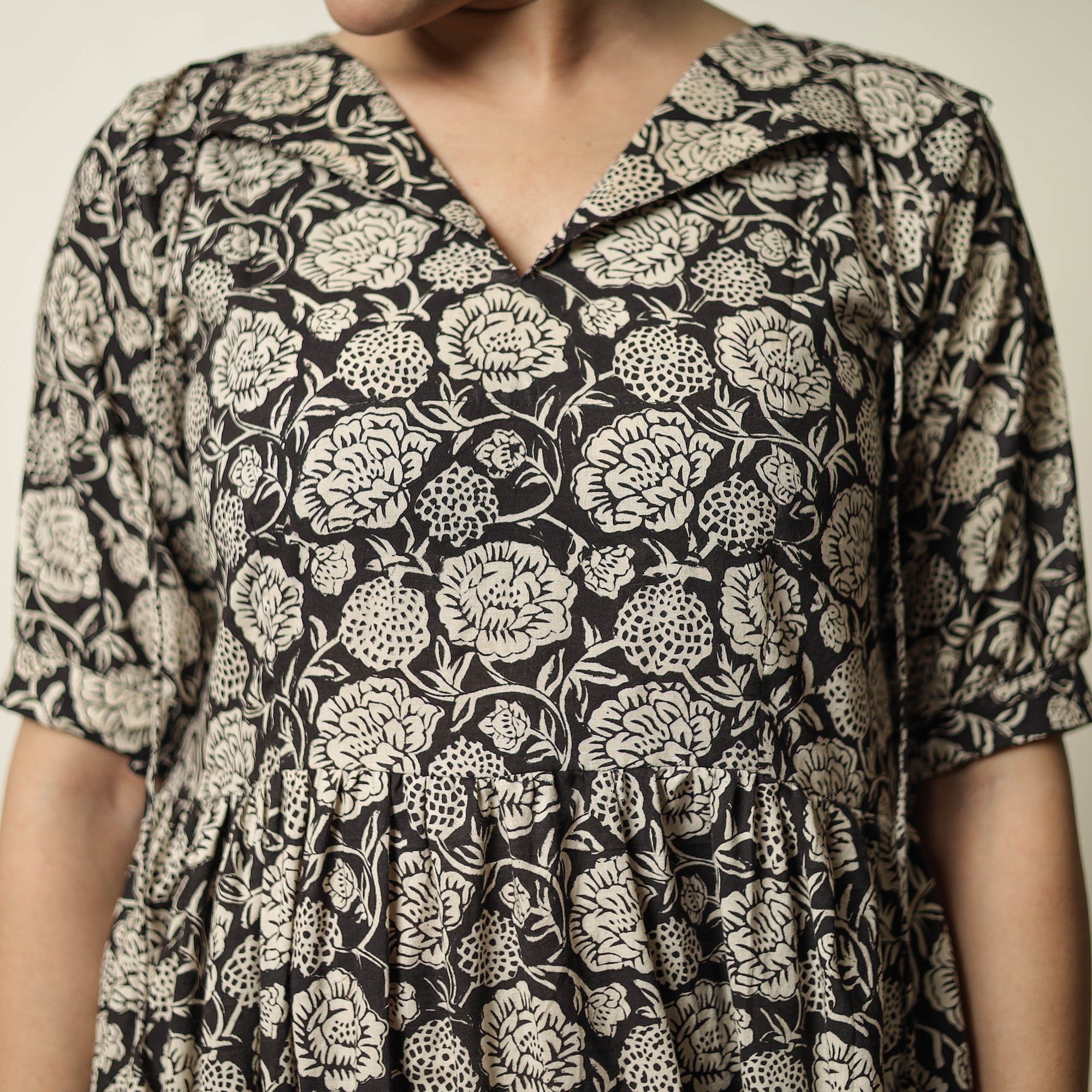 Indulge in the traditional charm of this bagru block-printed cotton tiered dress, thoughtfully designed to enhance your style. This dress is crafted from natural dyed cotton fabric, ensuring a comfortable feel against your skin.