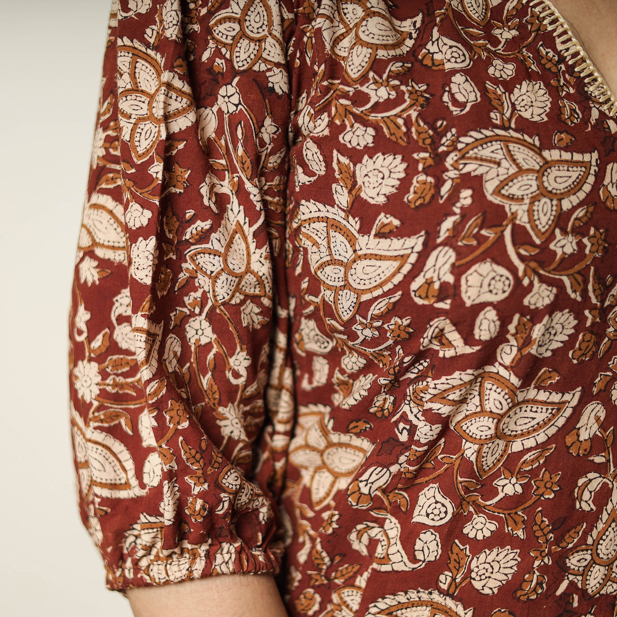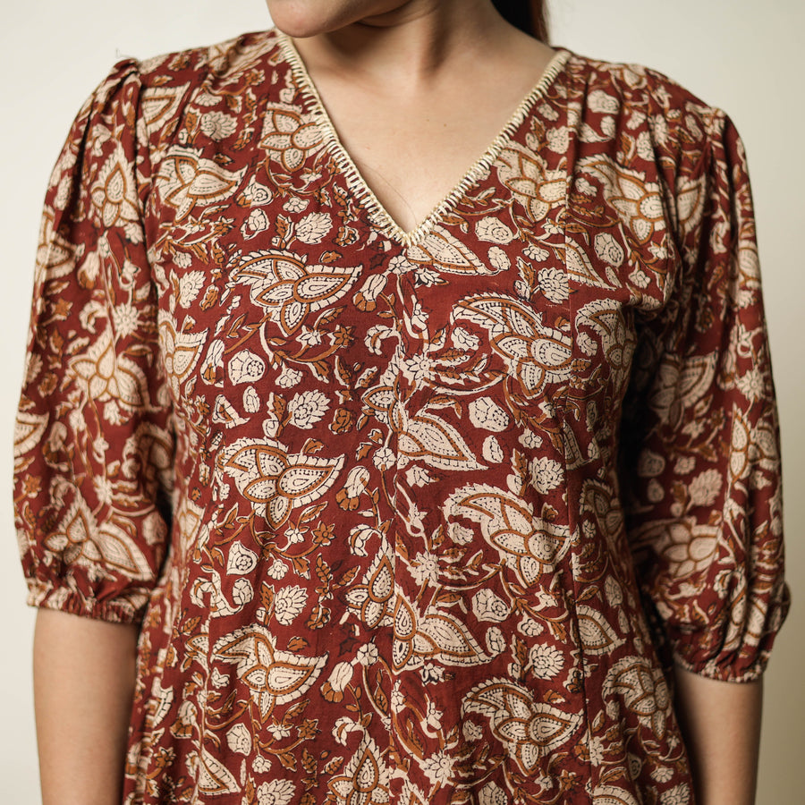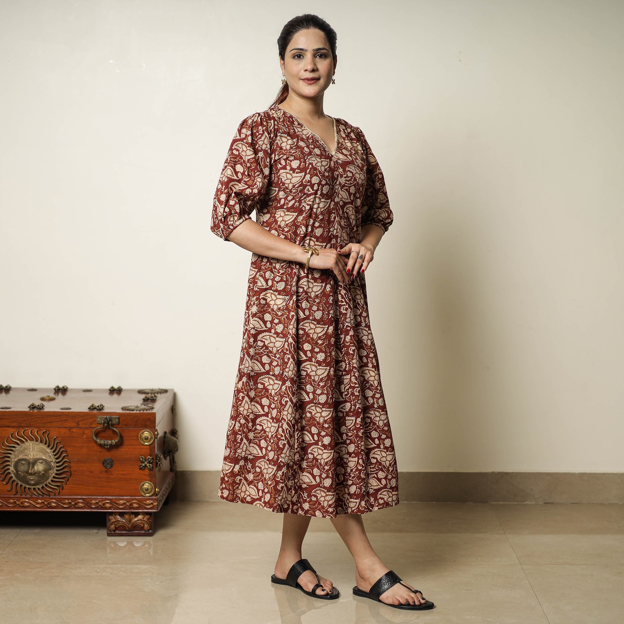Indulge in the traditional charm of this brown bagru block-printed cotton flared dress, thoughtfully designed to enhance your style. This dress is crafted from natural dyed cotton fabric, ensuring a comfortable feel against your skin.