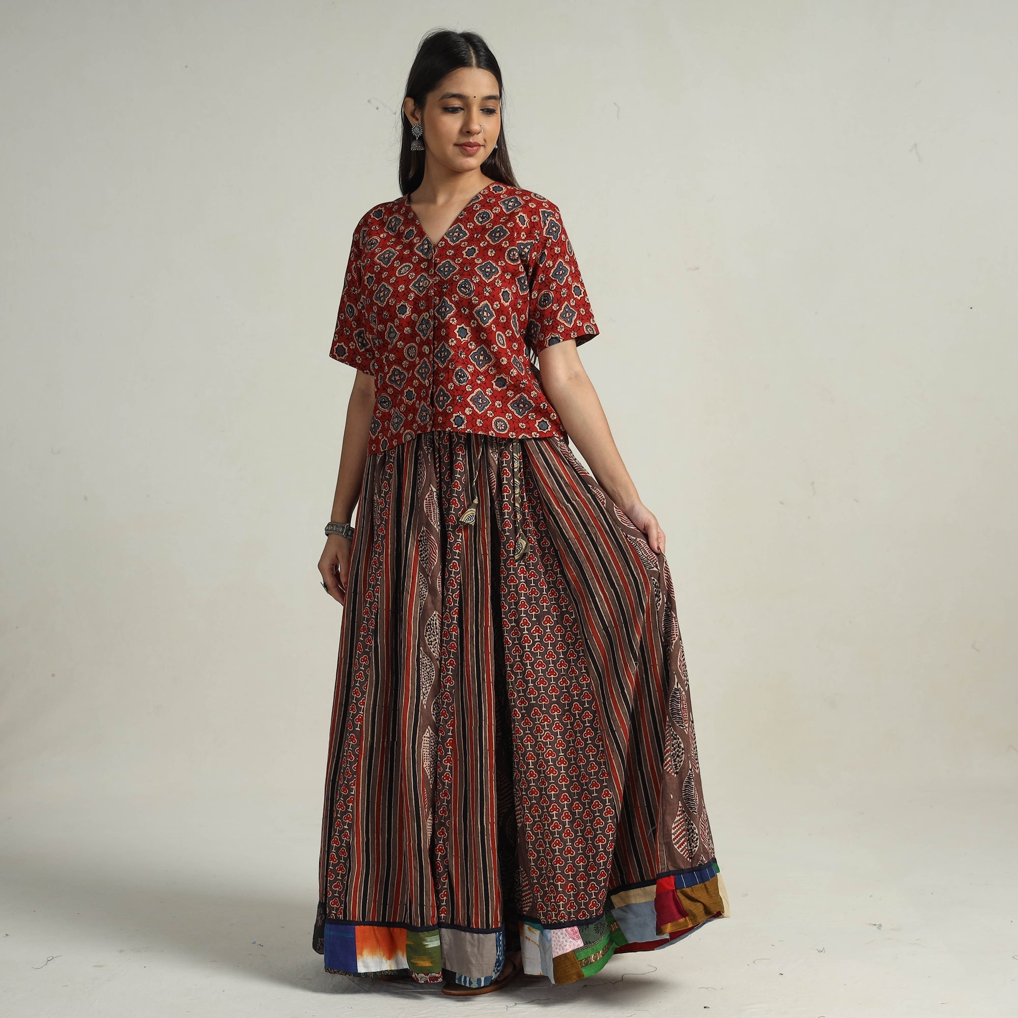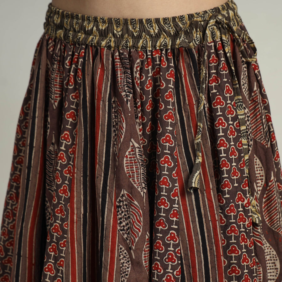 Elevate your wardrobe with our brown patchwork long skirt, skillfully crafted from ajrakh block-printed, natural-dyed cotton fabric. This skirt boasts a waist tie-up closure, allowing for a customized and comfortable fit. The patchwork 24-kali design adds a unique touch, showcasing the skilled craftsmanship behind its creation. The intricate patterns and vibrant colors reflect the cultural heritage of Gujarat.