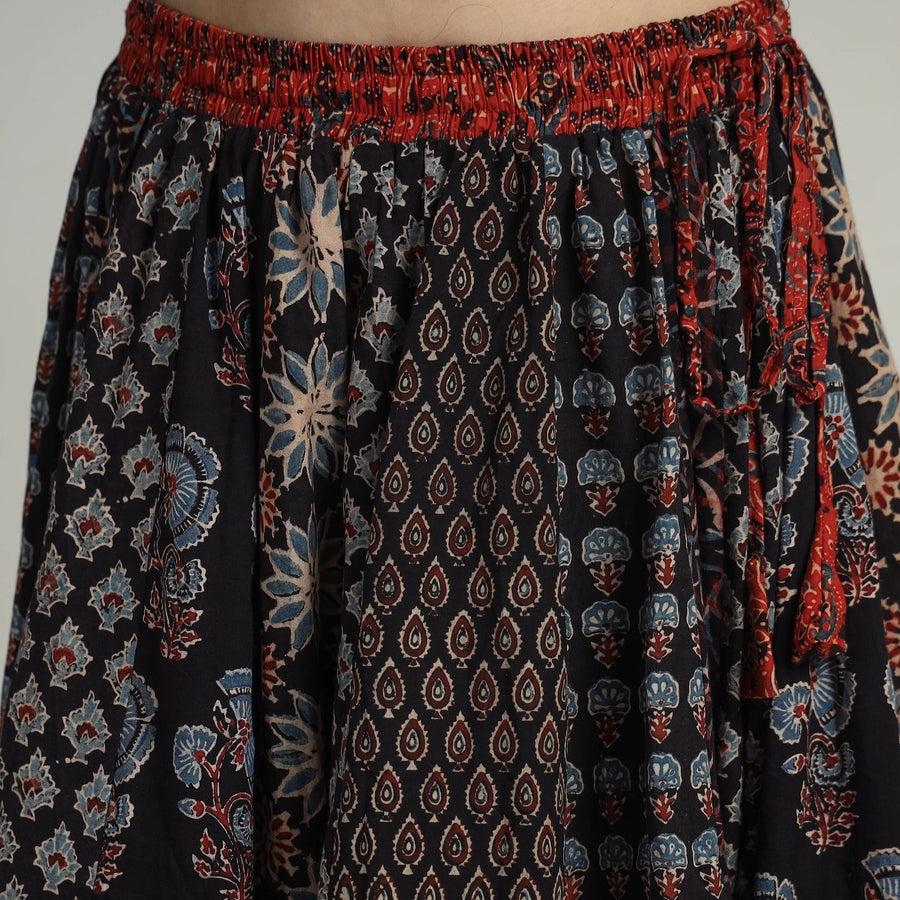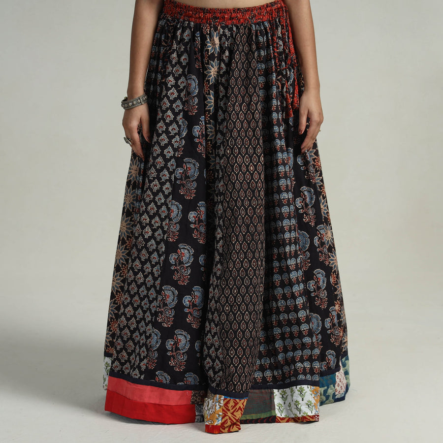 Elevate your wardrobe with our black patchwork long skirt, skillfully crafted from ajrakh block-printed, natural-dyed cotton fabric. This skirt boasts a waist tie-up closure, allowing for a customized and comfortable fit. The patchwork 24-kali design adds a unique touch, showcasing the skilled craftsmanship behind its creation. The intricate patterns and vibrant colors reflect the cultural heritage of Gujarat.