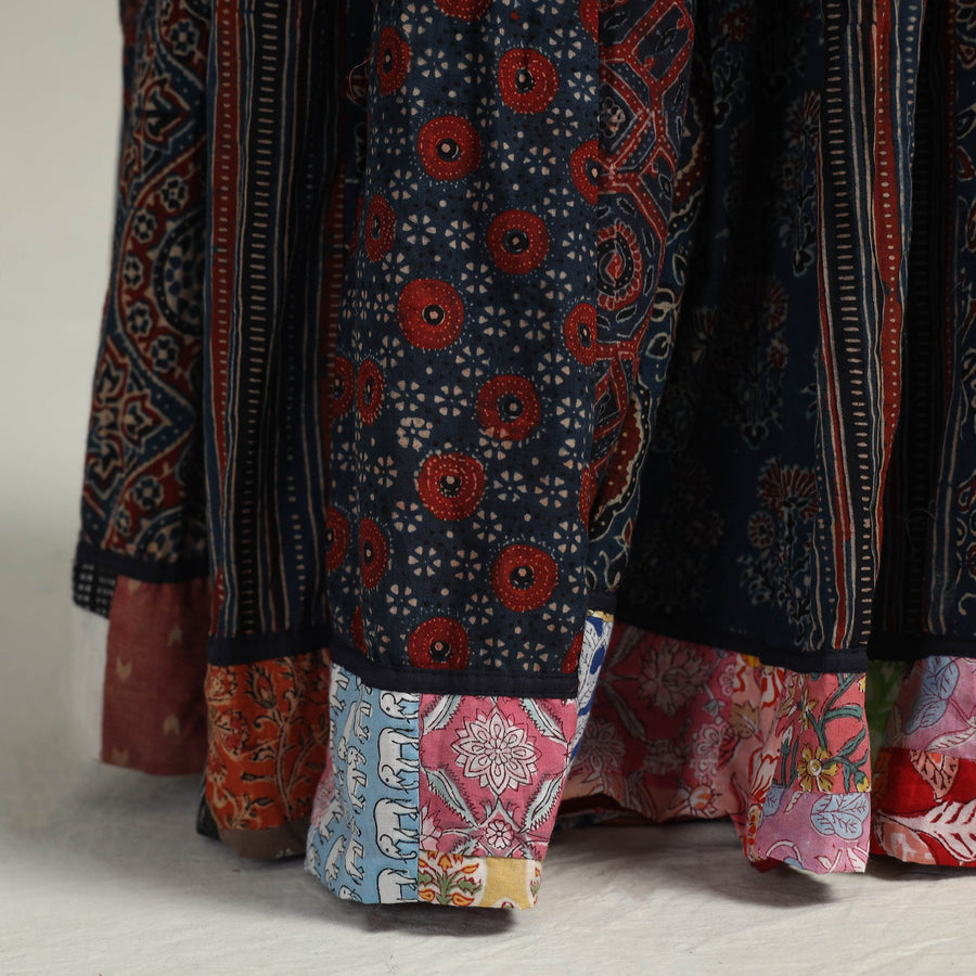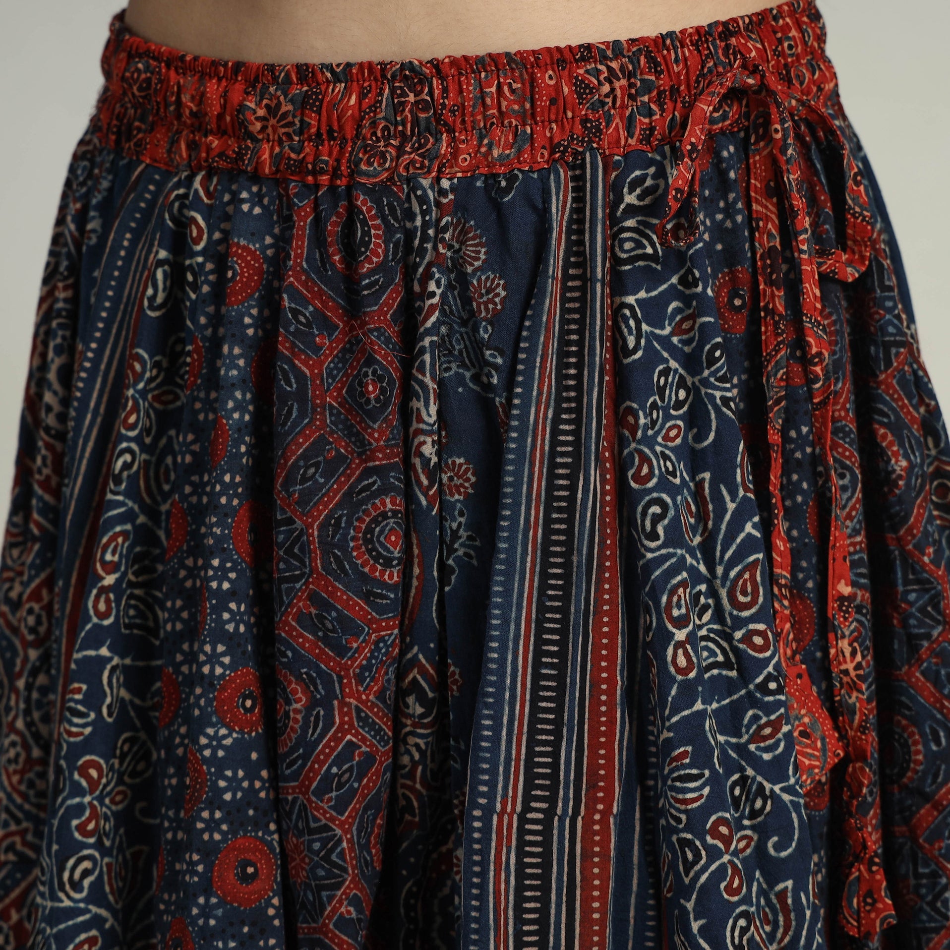 Elevate your wardrobe with our blue patchwork long skirt, skillfully crafted from ajrakh block-printed, natural-dyed cotton fabric. This skirt boasts a waist tie-up closure, allowing for a customized and comfortable fit. The patchwork 24-kali design adds a unique touch, showcasing the skilled craftsmanship behind its creation. The intricate patterns and vibrant colors reflect the cultural heritage of Gujarat.