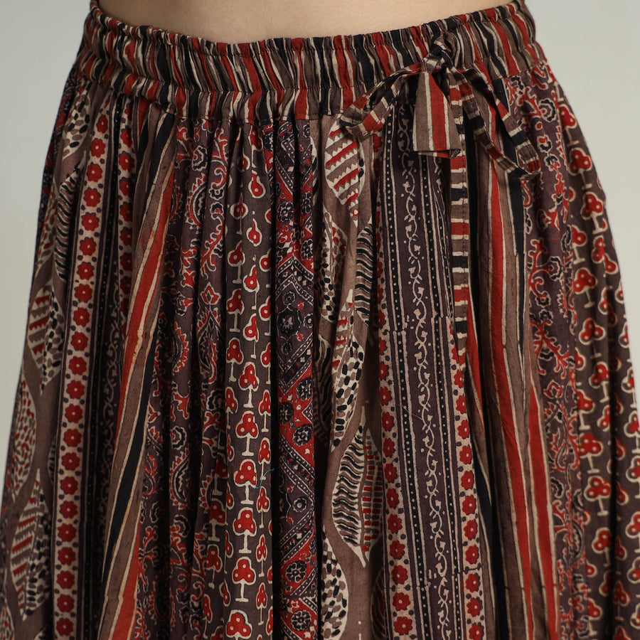 Elevate your wardrobe with our brown patchwork long skirt, skillfully crafted from ajrakh block-printed, natural-dyed cotton fabric. This skirt boasts a waist tie-up closure, allowing for a customized and comfortable fit. The patchwork 24-kali design adds a unique touch, showcasing the skilled craftsmanship behind its creation. The intricate patterns and vibrant colors reflect the cultural heritage of Gujarat.