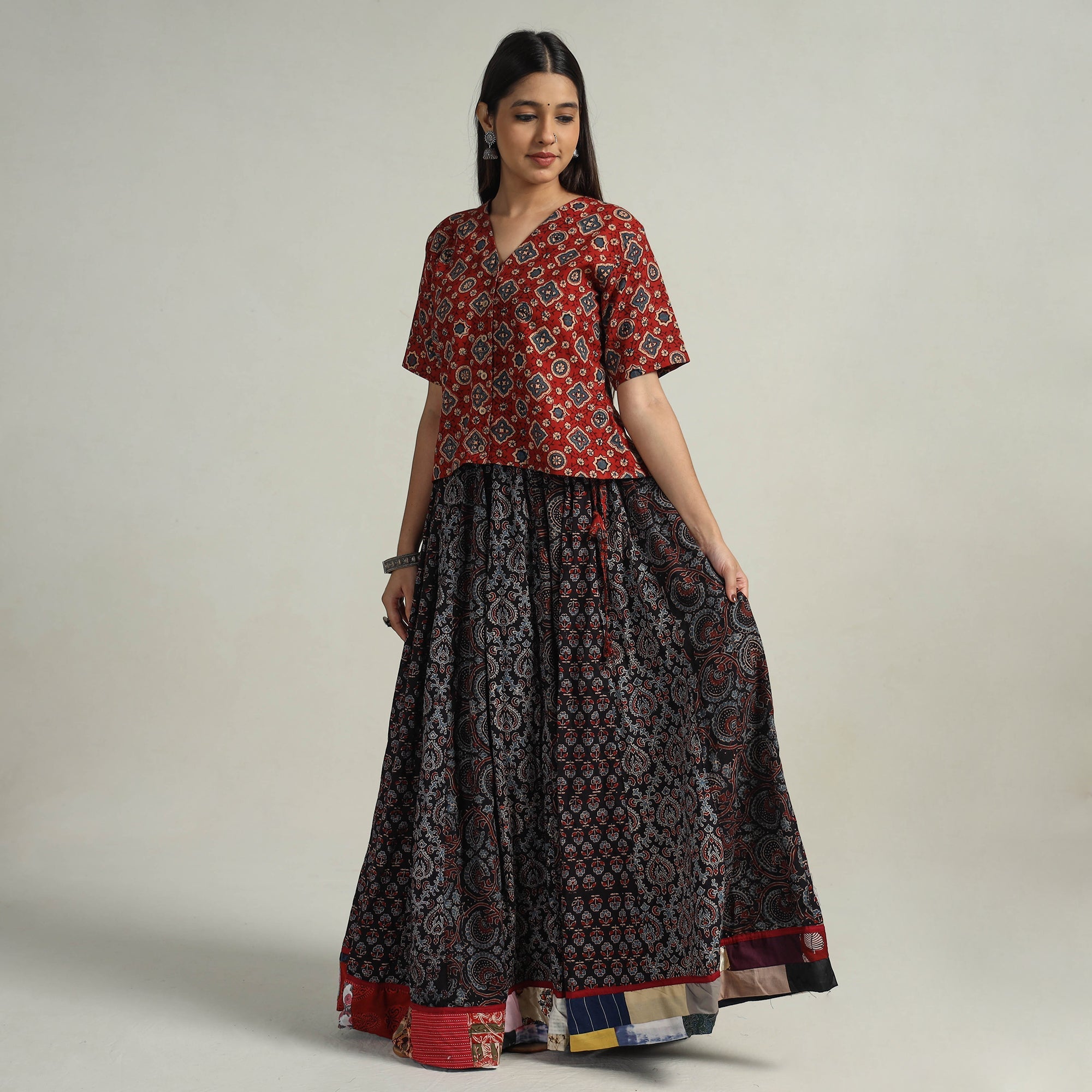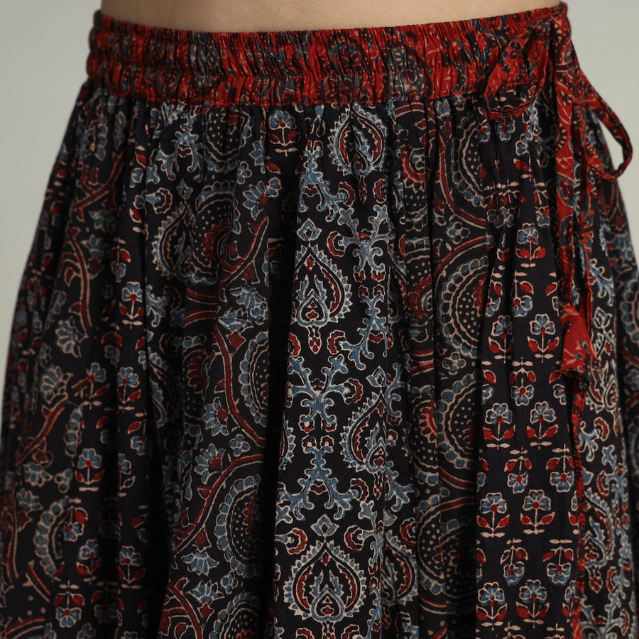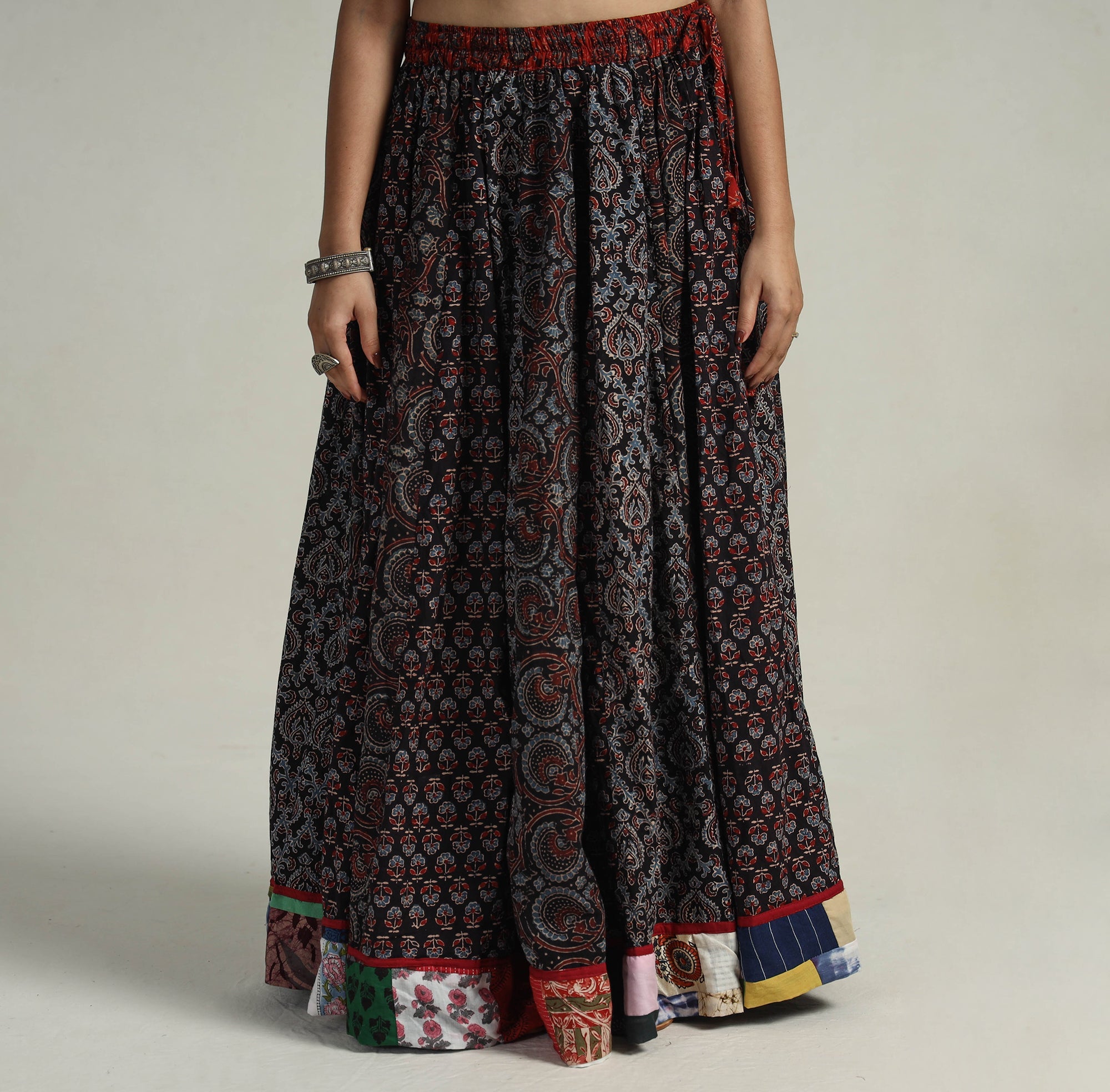 Elevate your wardrobe with our black patchwork long skirt, skillfully crafted from ajrakh block-printed, natural-dyed cotton fabric. This skirt boasts a waist tie-up closure, allowing for a customized and comfortable fit. The patchwork 24-kali design adds a unique touch, showcasing the skilled craftsmanship behind its creation. The intricate patterns and vibrant colors reflect the cultural heritage of Gujarat.
