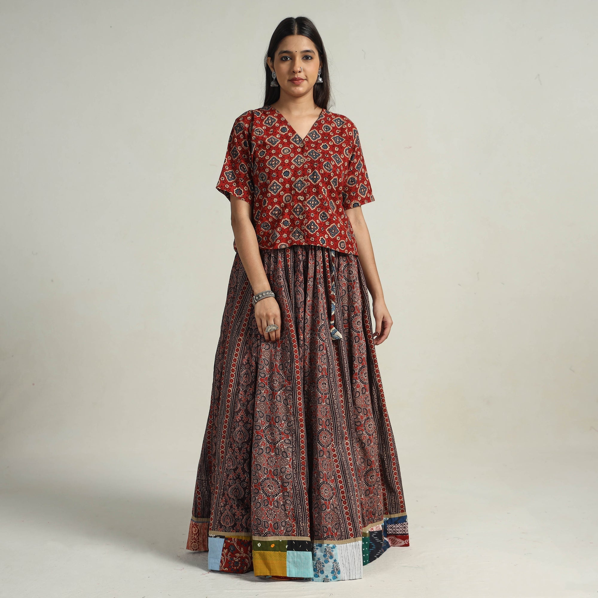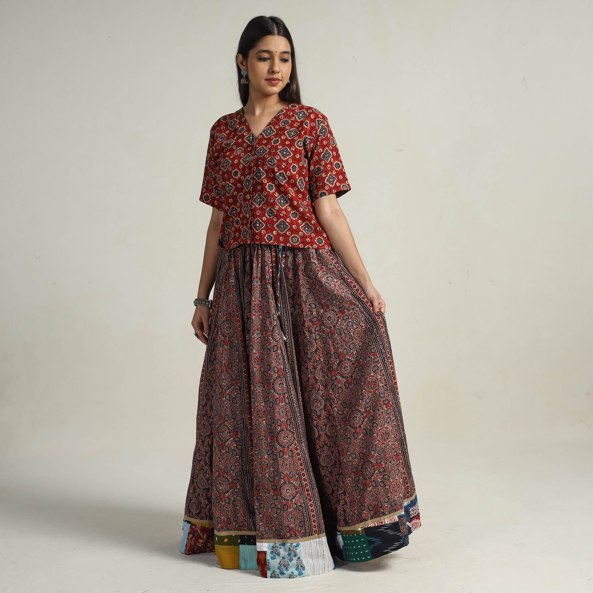 Elevate your wardrobe with our brown patchwork long skirt, skillfully crafted from ajrakh block-printed, natural-dyed cotton fabric. This skirt boasts a waist tie-up closure, allowing for a customized and comfortable fit. The patchwork 24-kali design adds a unique touch, showcasing the skilled craftsmanship behind its creation. The intricate patterns and vibrant colors reflect the cultural heritage of Gujarat.