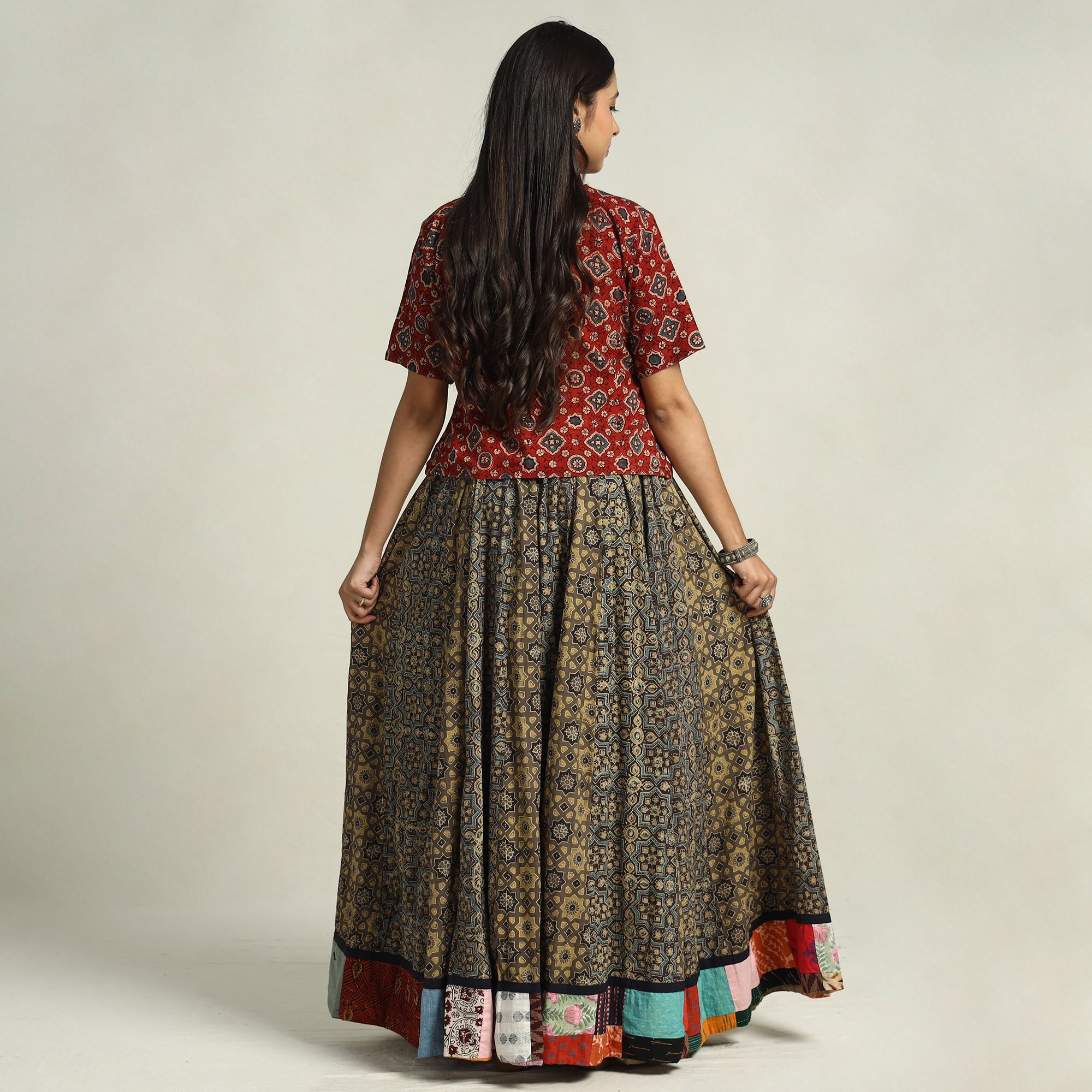 Elevate your wardrobe with our brown patchwork long skirt, skillfully crafted from ajrakh block-printed, natural-dyed cotton fabric. This skirt boasts a waist tie-up closure, allowing for a customized and comfortable fit. The patchwork 24-kali design adds a unique touch, showcasing the skilled craftsmanship behind its creation. The intricate patterns and vibrant colors reflect the cultural heritage of Gujarat.
