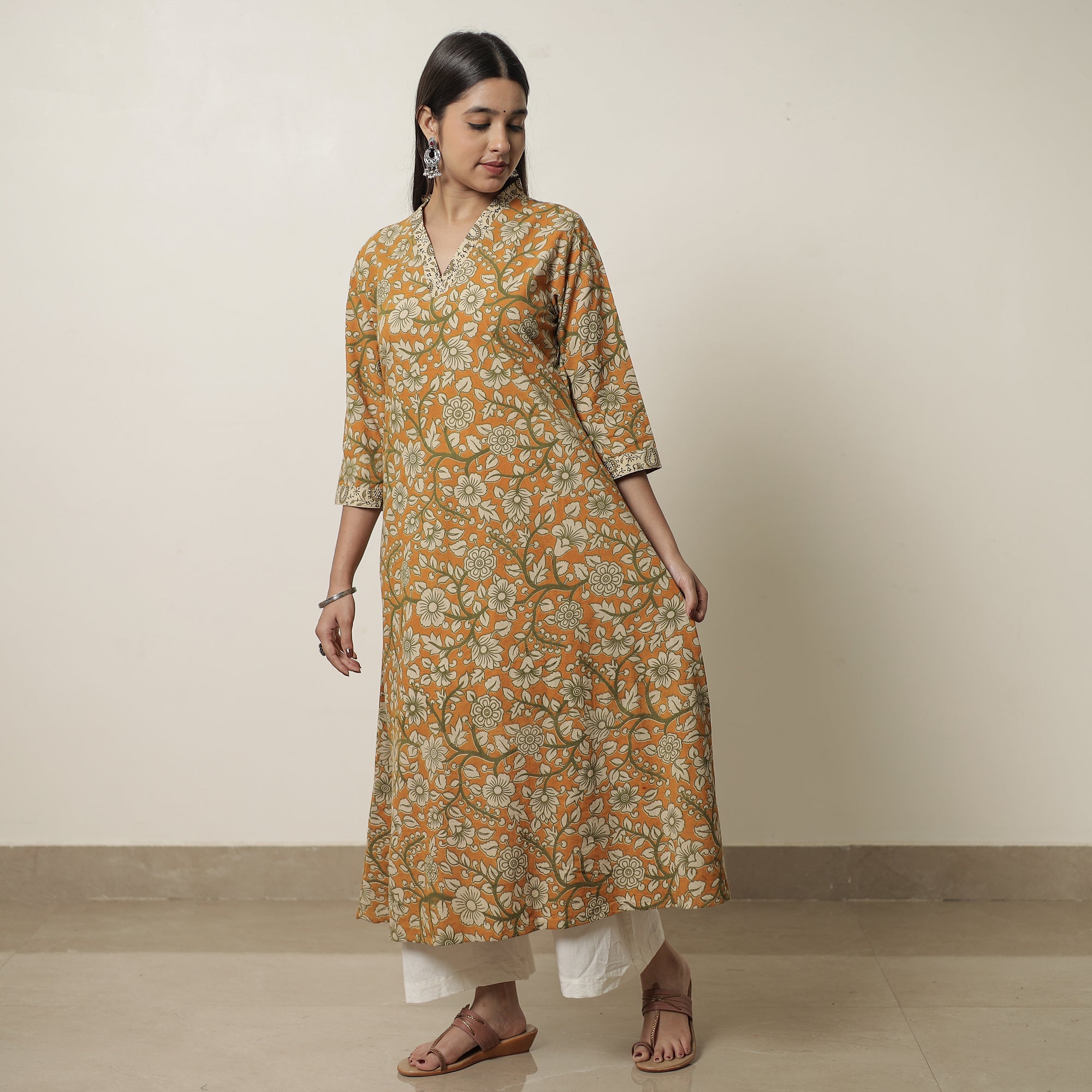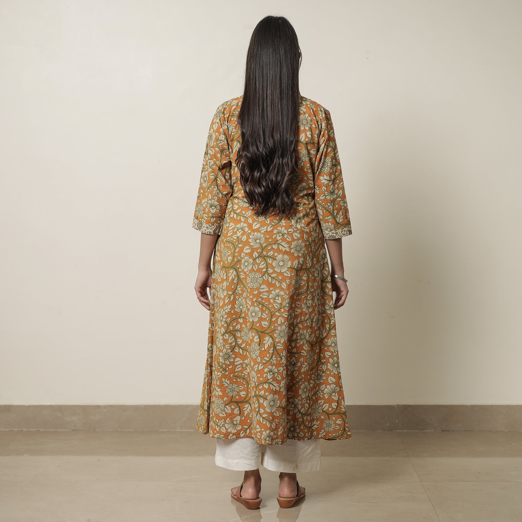 This uniquely designed printed cotton a-line kalamkari kurta is a perfect blend of style and comfort. Crafted from high-quality cotton fabric, it ensures a soft and comfortable feel against your skin. The kurta also features a convenient one-side pocket, perfect for carrying small essentials. It's an ideal choice for both casual and festive occasions.