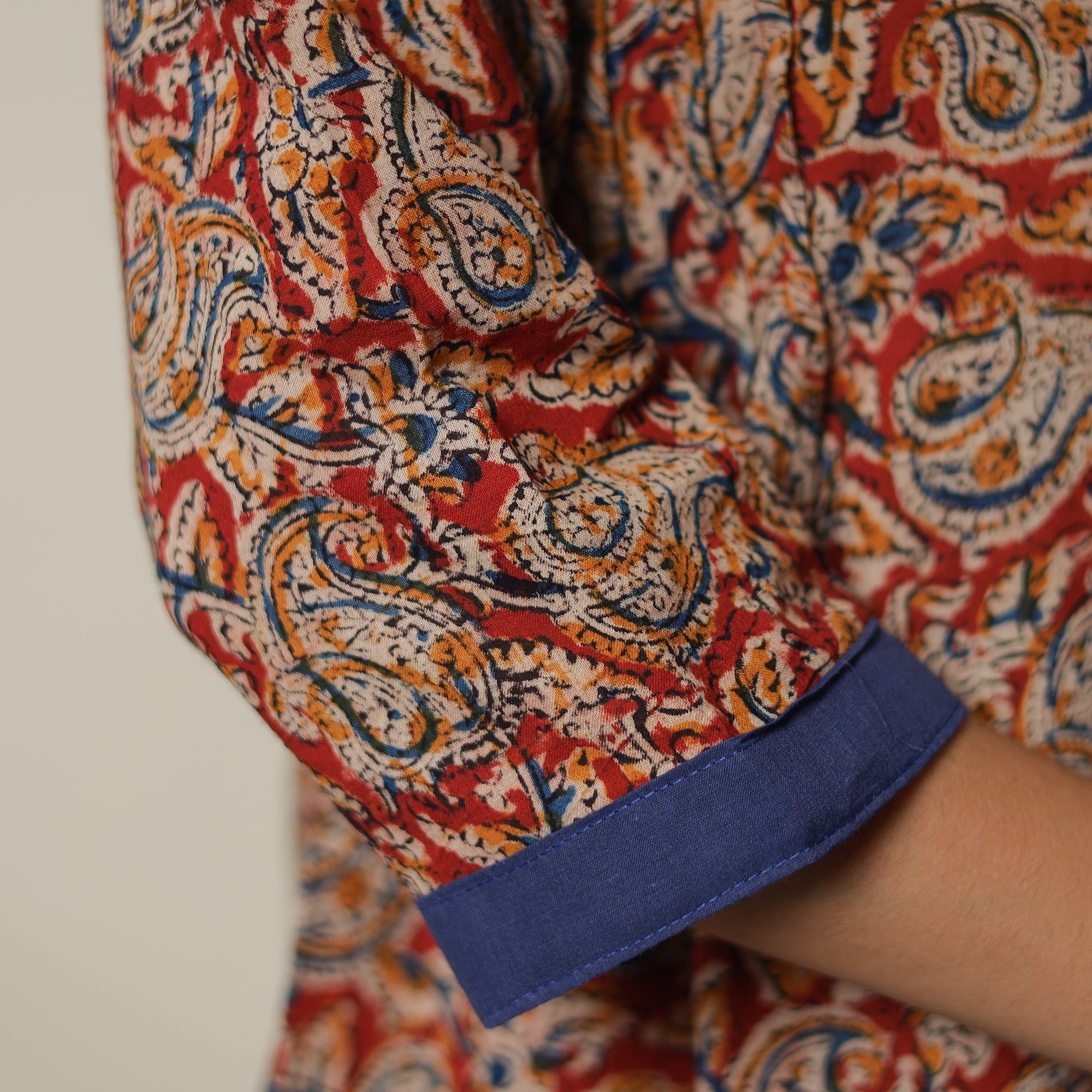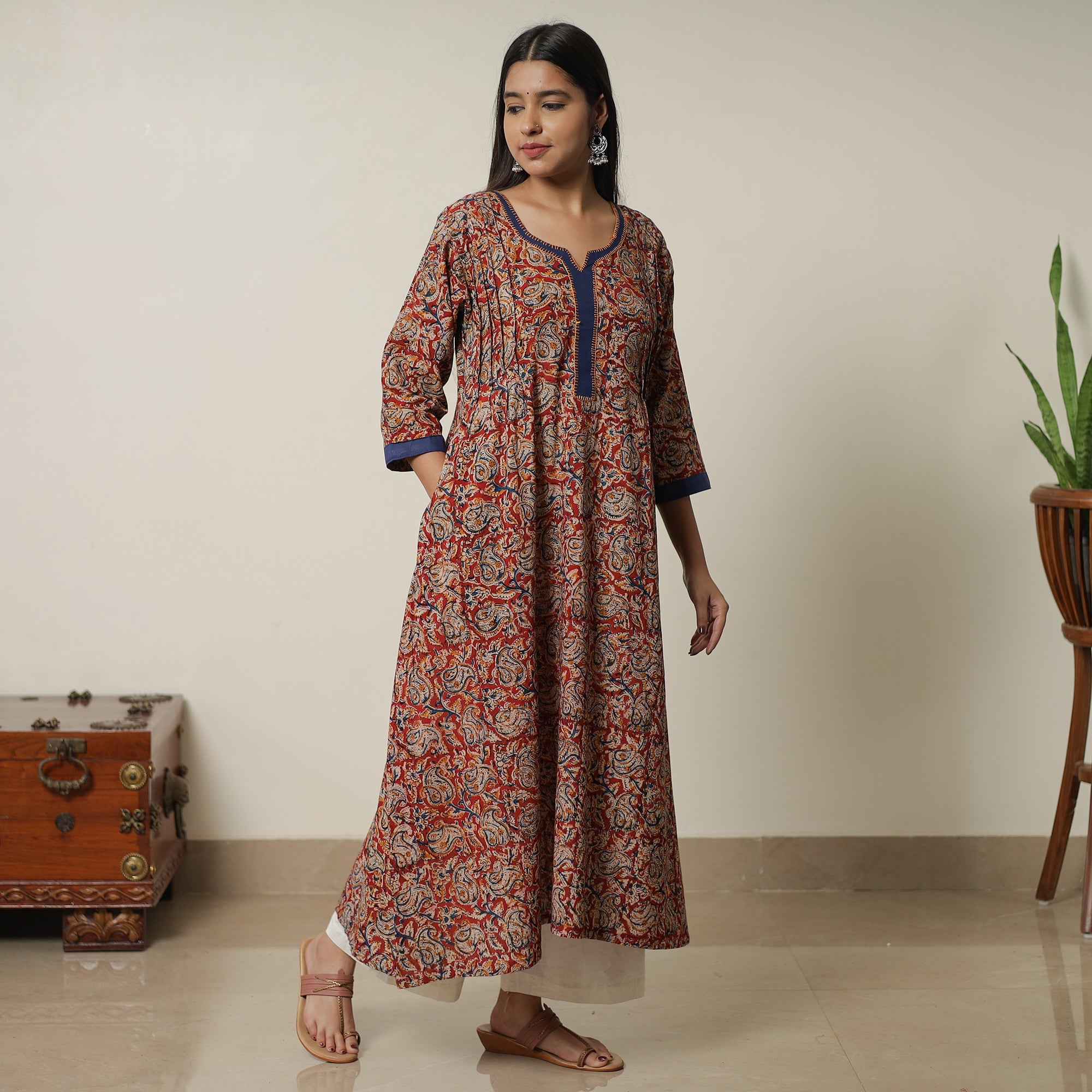 This uniquely designed pedana red hand-block-printed cotton A-line kalamkari kurta with tagai work is a perfect blend of style and comfort. Crafted from natural-dyed cotton fabric, it ensures a comfortable feel against your skin. The kurta also features a convenient one-side pocket, perfect for carrying small essentials.