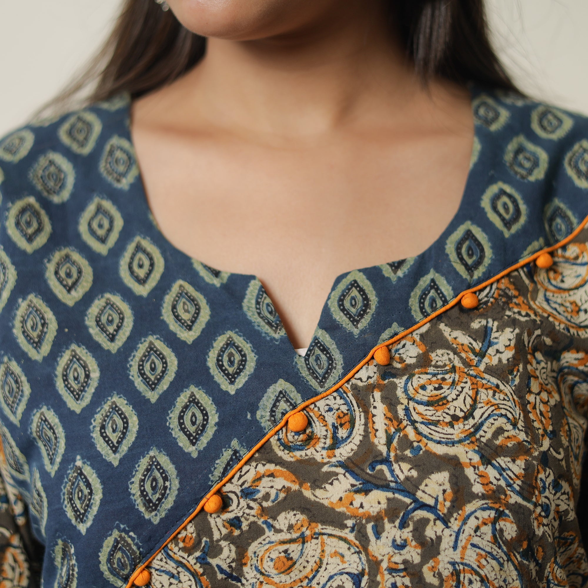 This uniquely designed pedana hand-block-printed cotton short kalamkari kurta with ajrakh patchwork is a perfect blend of style and comfort. Crafted from natural-dyed cotton fabric, it ensures a comfortable feel against your skin. It boasts an exquisite ajrakh patchwork design, adding a touch of elegance to your ensemble. It's an ideal choice for both casual and festive occasions.
