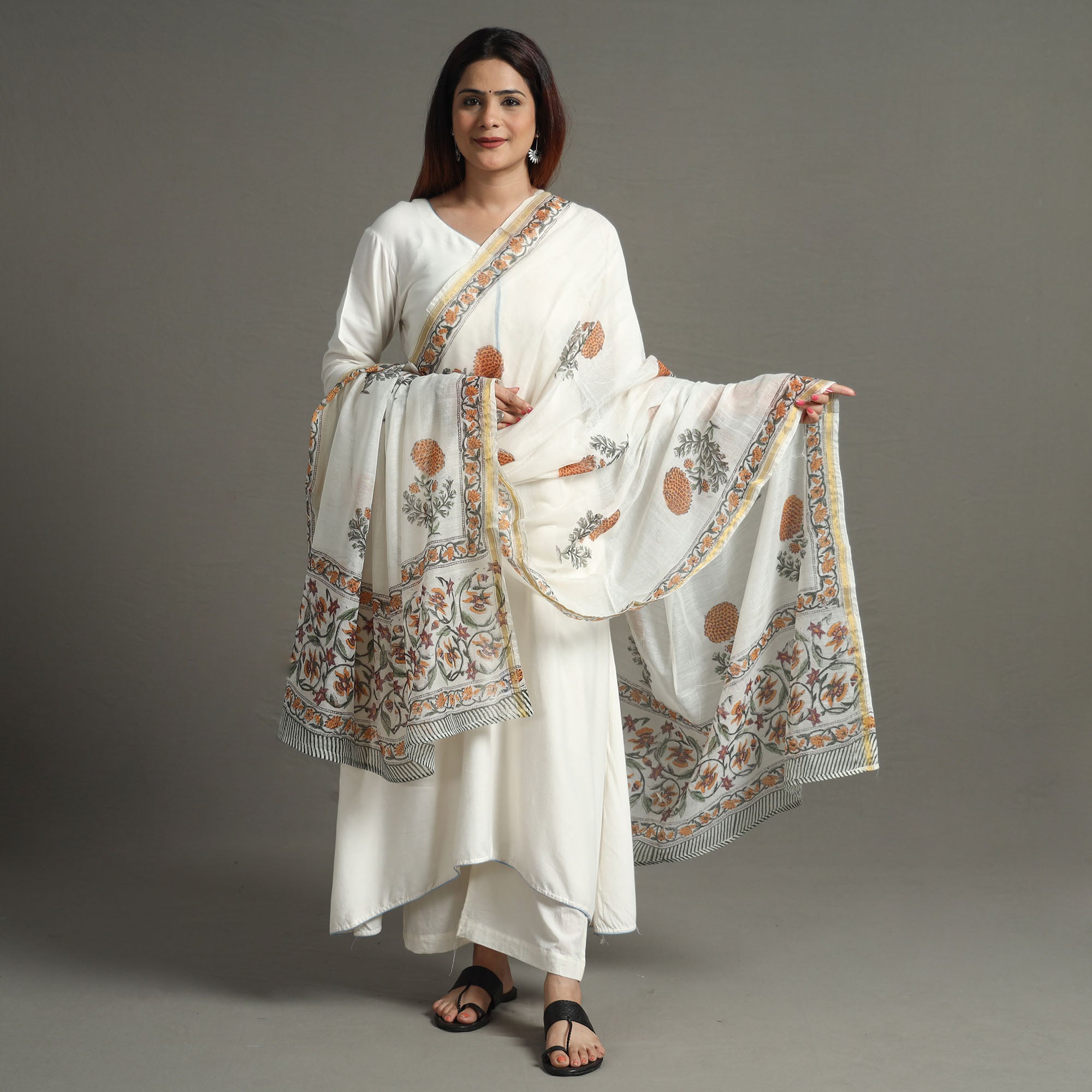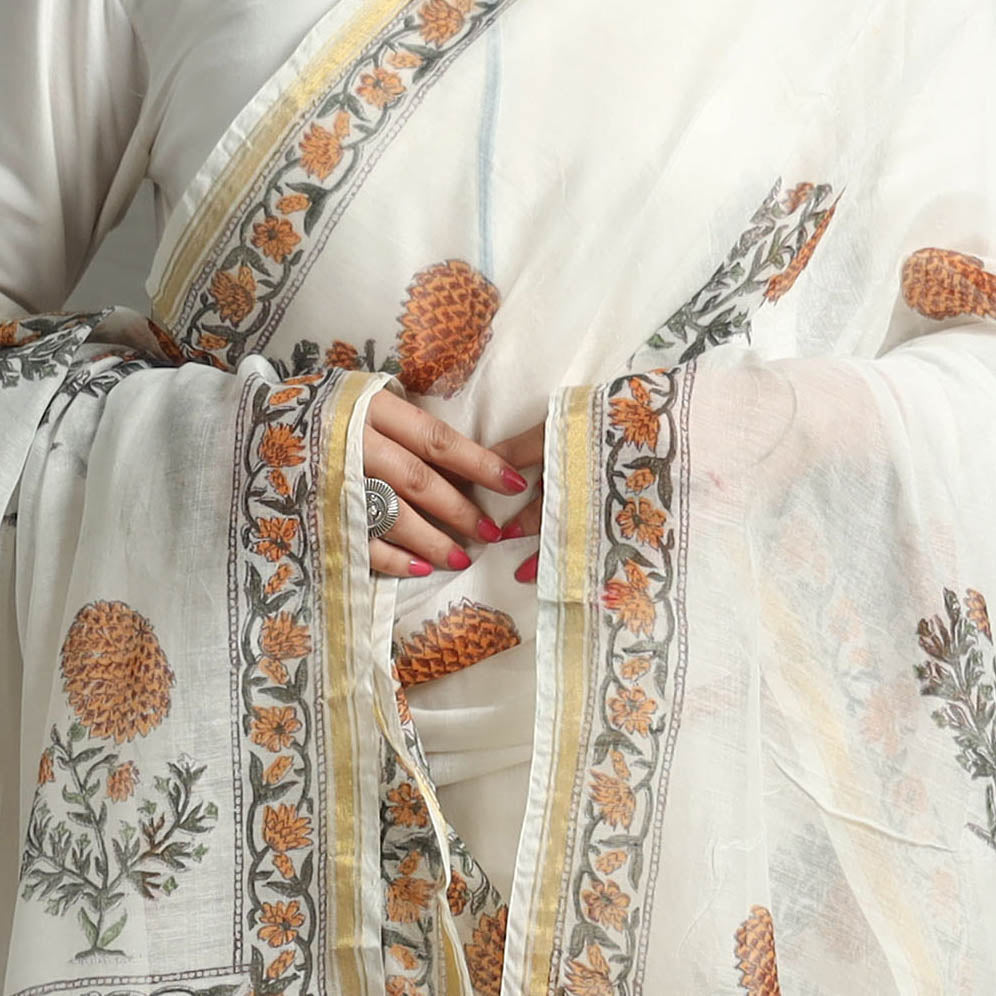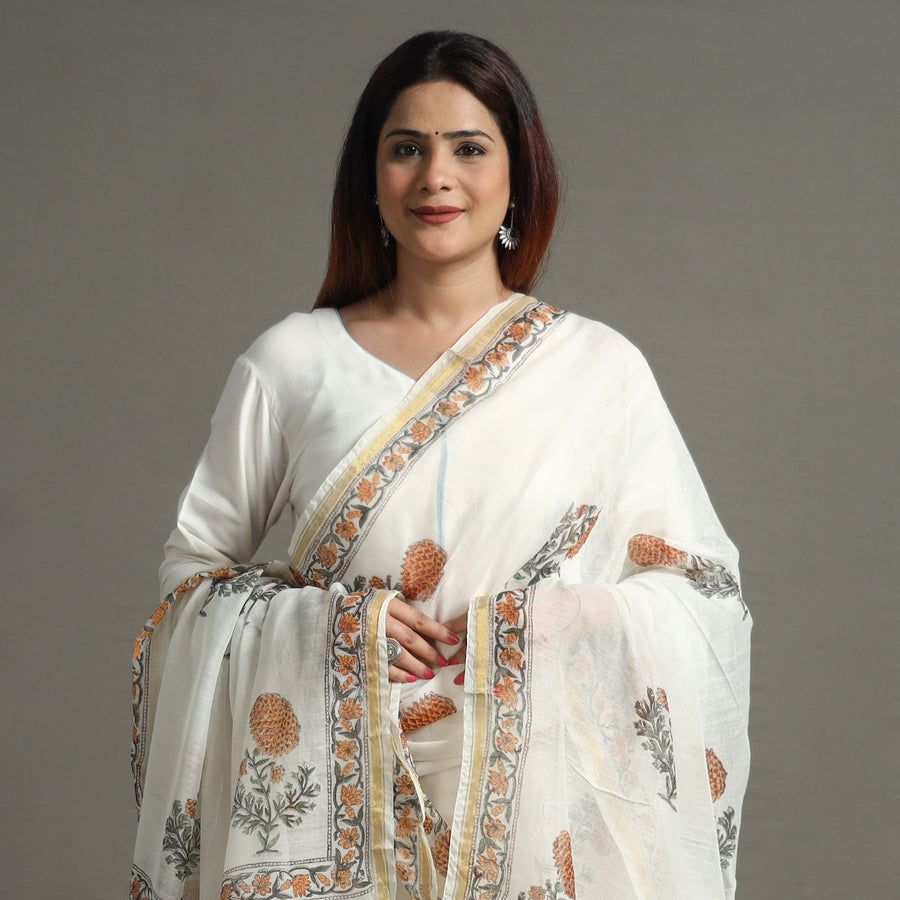 Elevate your style with our exquisite sanganeri hand-block-printed chanderi silk dupatta with a zari border. Crafted with precision and adorned with bleed-free VAT dyes, it exudes fine quality and vibrant hues. Sanganeri is a hand-block printing technique originating from Sanganer, a village in the southern part of Jaipur, Rajasthan.