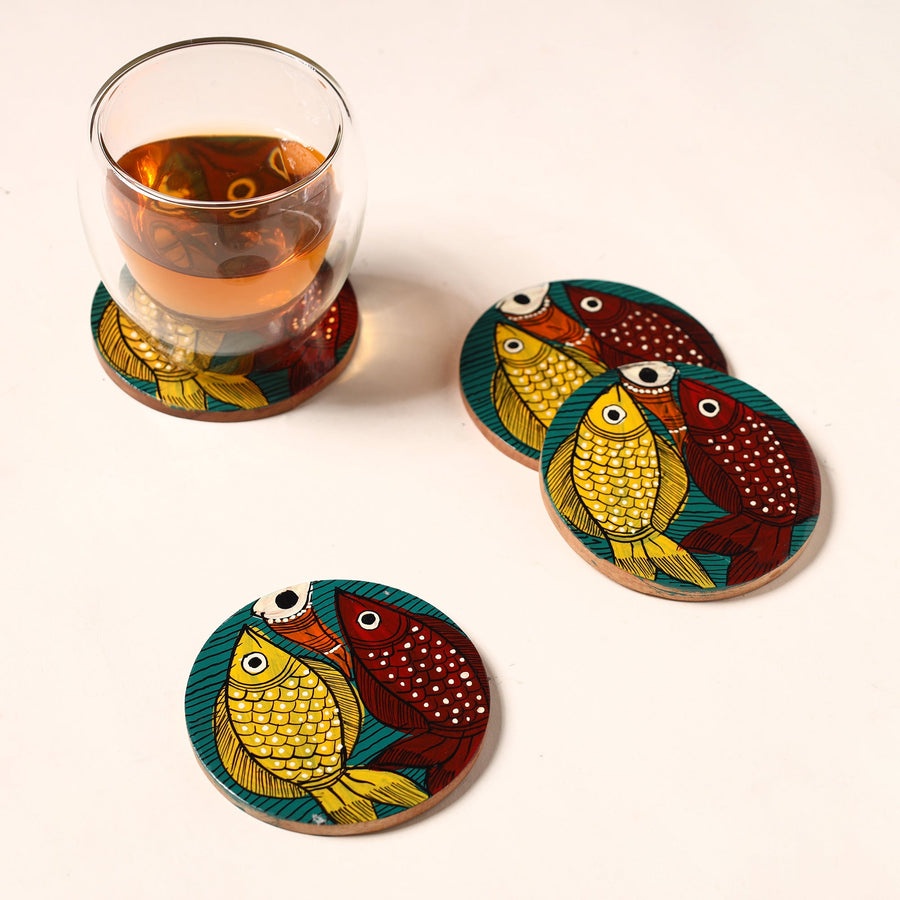 Elevate your tabletop decor with these exquisite traditional patua art coasters, meticulously crafted from akashmoni wood. Hand-painted with vibrant acrylic colors by skilled artisans in West Bengal, it brings a touch of India's rich artistic heritage to your home. Protect your surfaces in style while appreciating the artistry of these unique coasters.