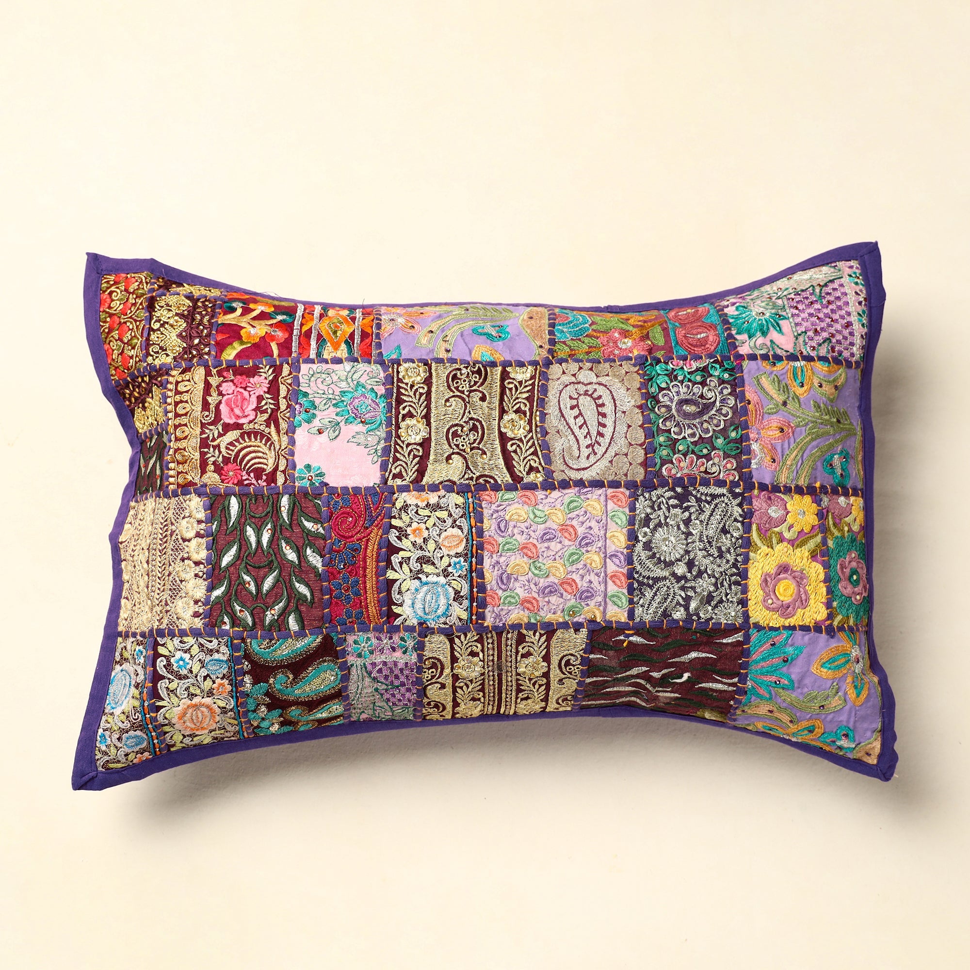 Elevate your home decor with our exquisite handcrafted purple khambadiya patchwork cotton pillow cover, skillfully crafted by artisans in Barmer, Rajasthan. This exquisite pillow cover showcases intricate embroidery on the front, protected by a durable cotton lining at the back. Perfect for adding a touch of artistry and comfort to any living space.
