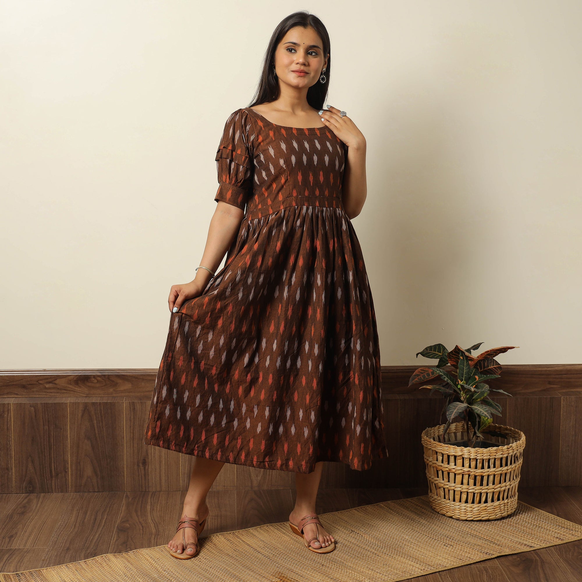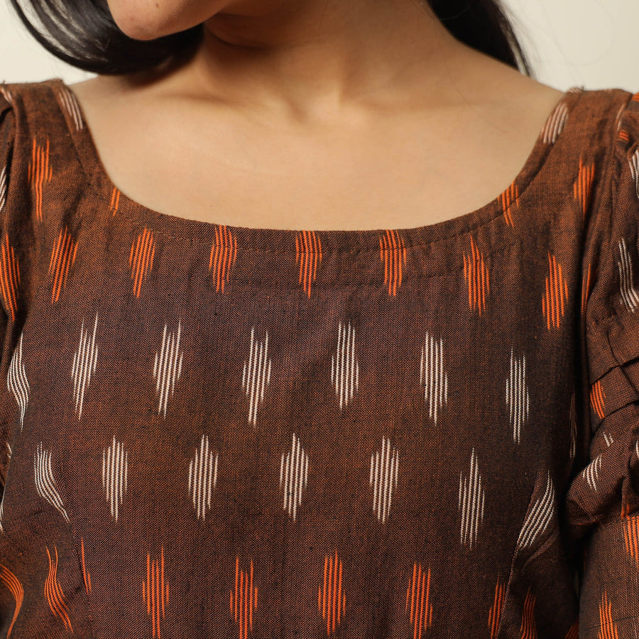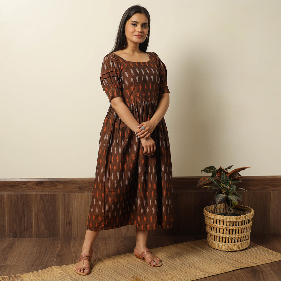 This uniquely designed pochampally ikat weave cotton flared dress is a perfect blend of style and comfort. Crafted from fine-quality cotton fabric, it ensures a comfortable feel against your skin. This dress is perfect for your daily outing and for a special occasion.