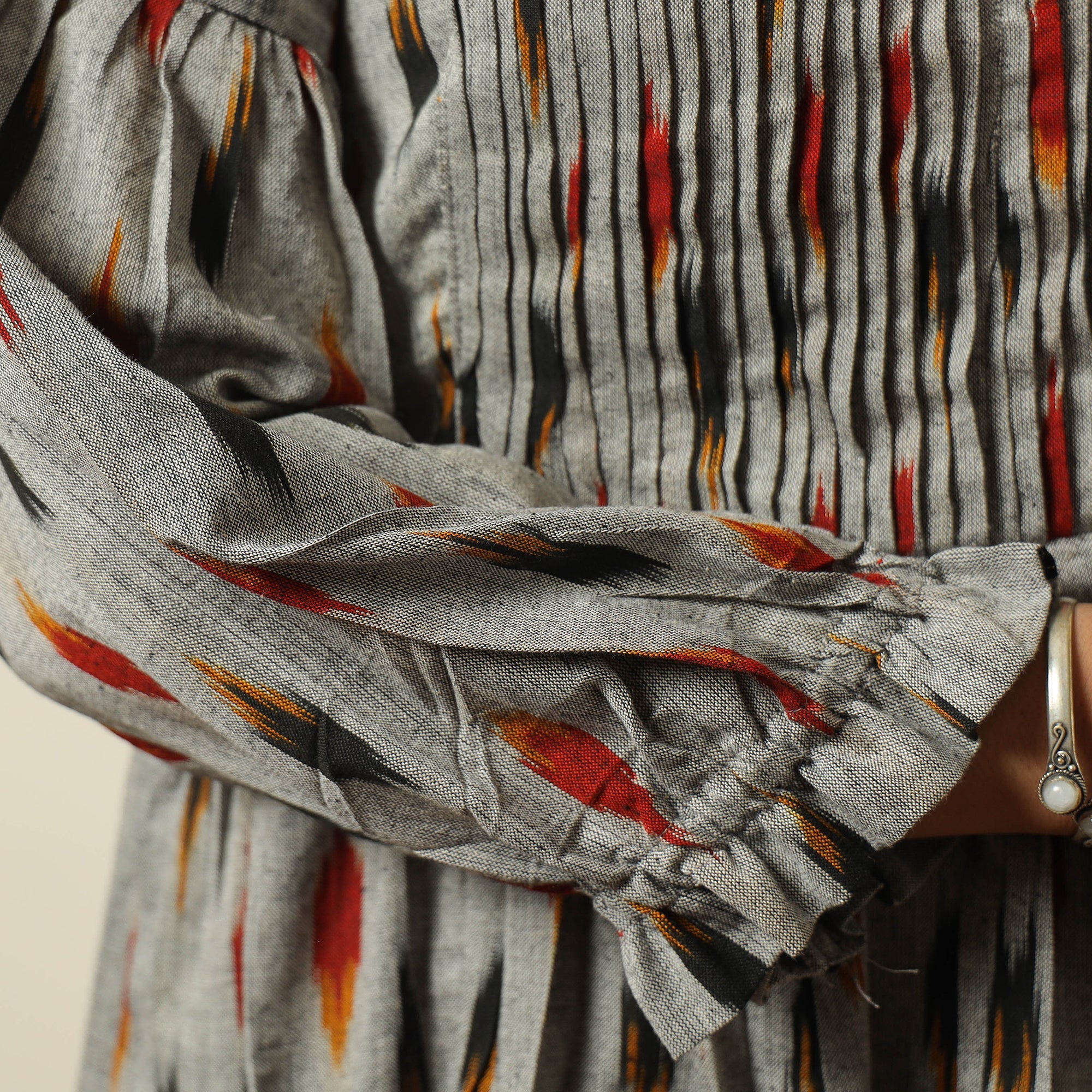This uniquely designed pochampally ikat weave cotton pintuck flared dress is a perfect blend of style and comfort. Crafted from fine-quality cotton fabric, it ensures a comfortable feel against your skin. This dress is perfect for your daily outing and for a special occasion.