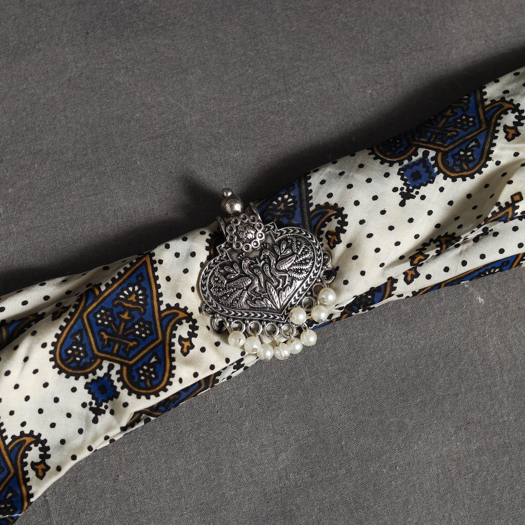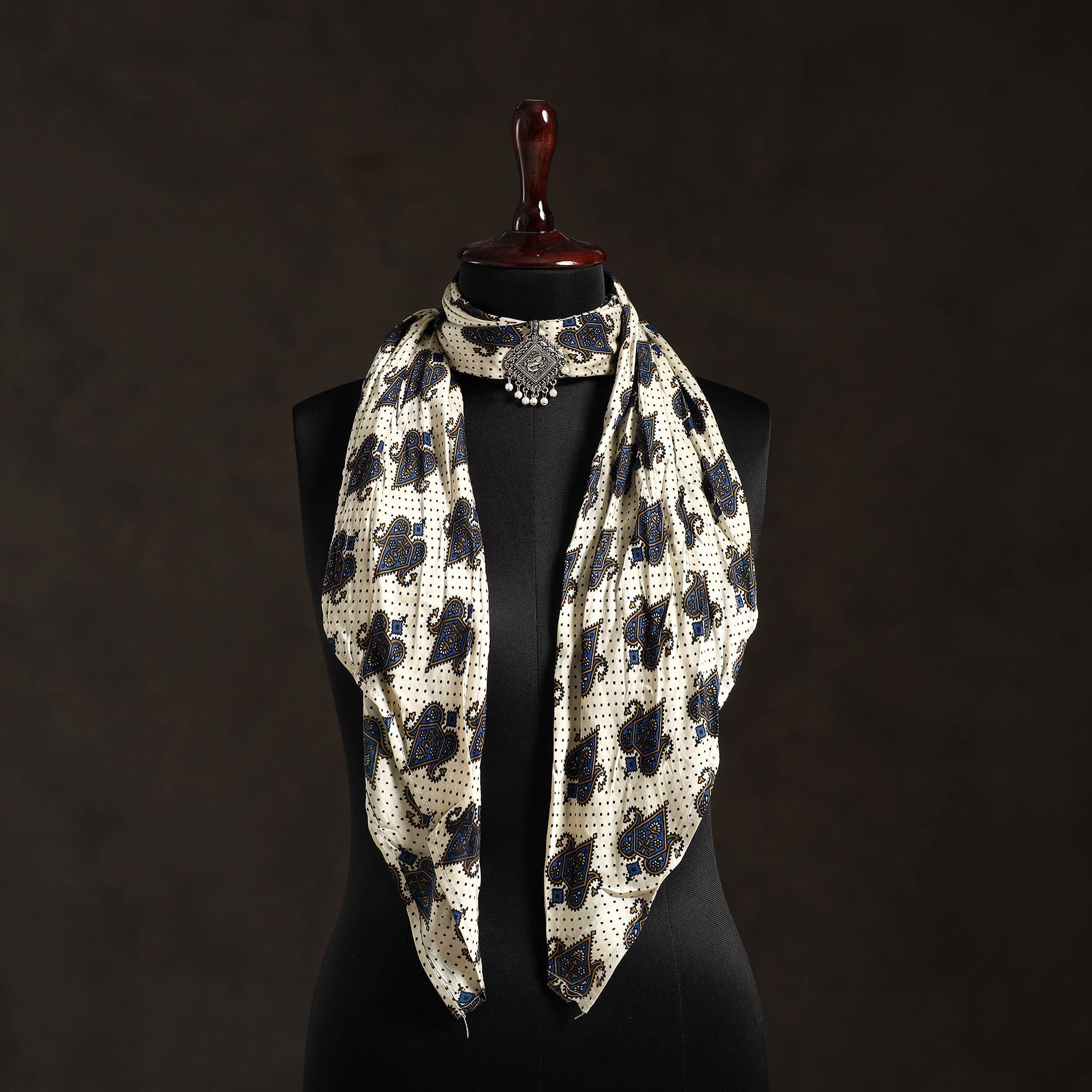 This white block-printed modal silk pendant necklace scarf is a luxurious and versatile accessory. Soft and comfortable, it showcases exquisite hand block printing. Wear it as a choker or long pendant to create different looks. Modal silk is a soft and highly lustrous fabric; the opulence of silk and the comfort of cotton modal is a fine and softly textured weave.