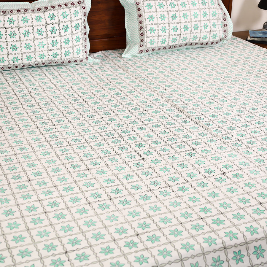 This sanganeri block-printed cotton double bed sheet with matching pillow covers is an exquisite and comfortable addition to any bedroom. Crafted using the traditional hand-block printing technique originating from Sanganer, Rajasthan. Its vibrant patterns and soft texture ensure a restful night's sleep while enhancing the overall look of your room.