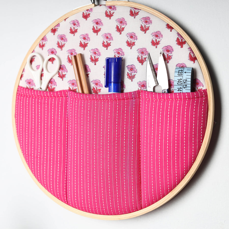 Handcrafted embroidery hoop wall decor is a unique and beautiful addition to any home, offering a stylish way to decorate your home. This hoop wall decor is made from mixed cotton fabrics, handcrafted by skilled artisans. Featuring three functional pockets for added practicality and charm for organizing essentials or displaying decor.