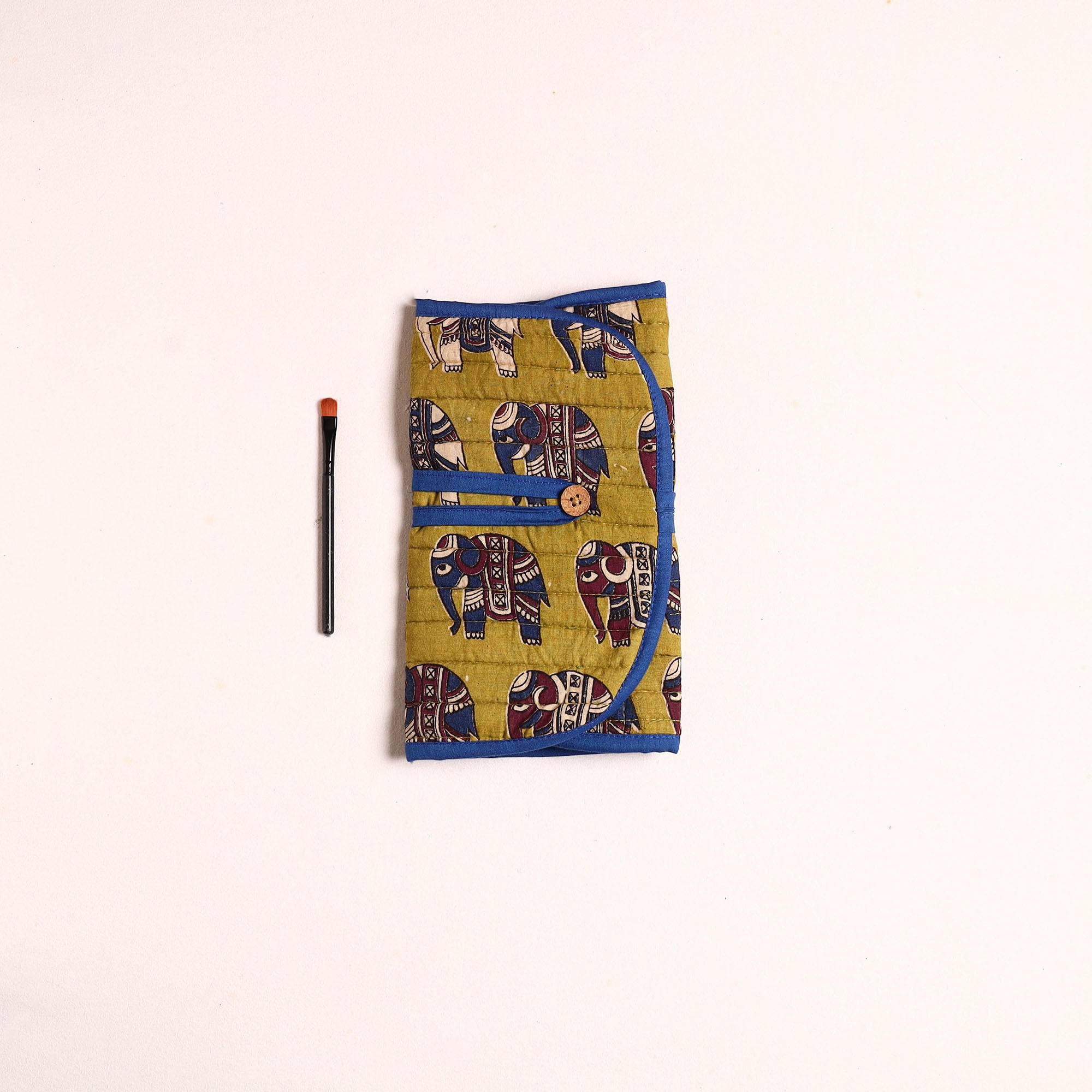Handcrafted multipurpose segmented make-up brush wrap pouch or storage organizer made from cotton fabrics and foam, textured with handmade textiles from India. Boasting one large and five small pockets, it ensures secure and organized storage for your brushes.