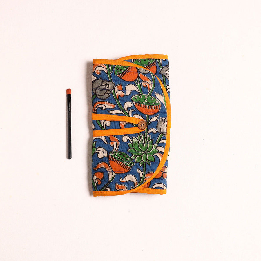 Handcrafted multipurpose segmented make-up brush wrap pouch or storage organizer made from cotton fabrics and foam, textured with handmade textiles from India. Boasting one large and five small pockets, it ensures secure and organized storage for your brushes.