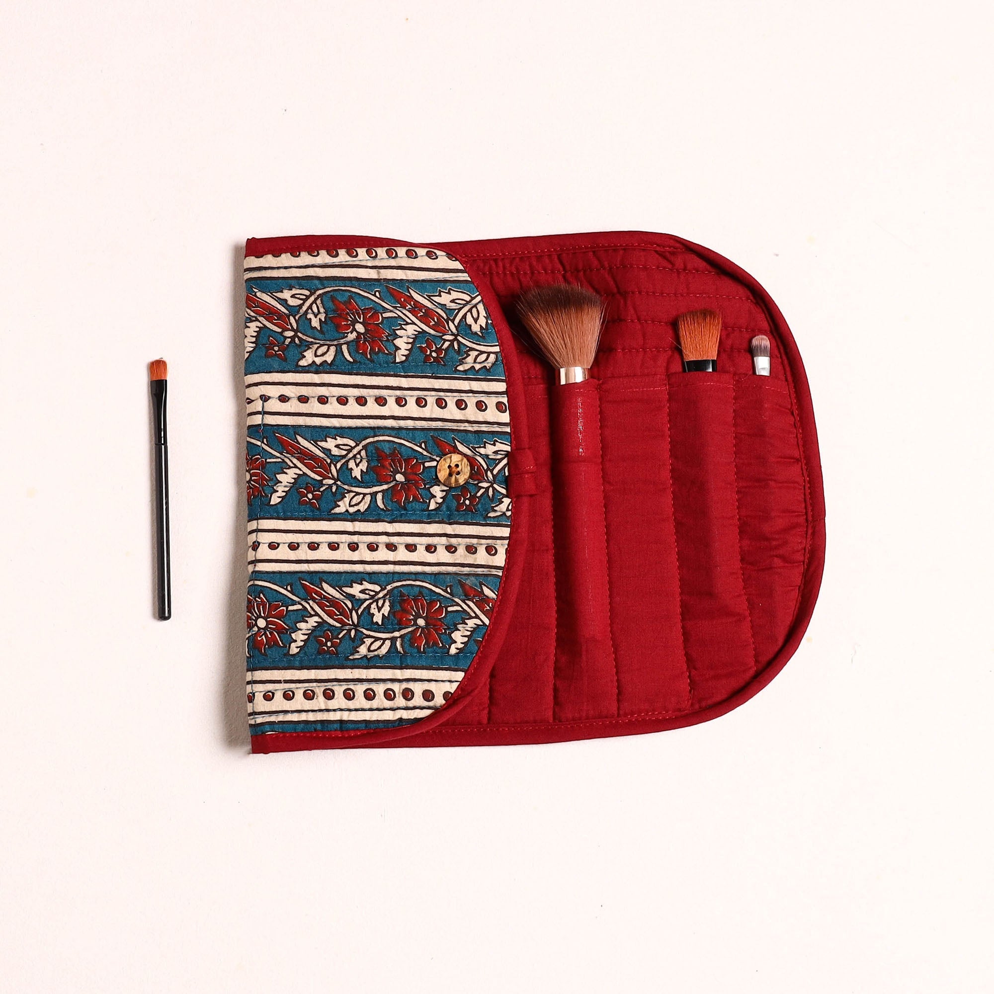 Handcrafted multipurpose segmented make-up brush wrap pouch or storage organizer made from cotton fabrics and foam, textured with handmade textiles from India. Boasting one large and five small pockets, it ensures secure and organized storage for your brushes.