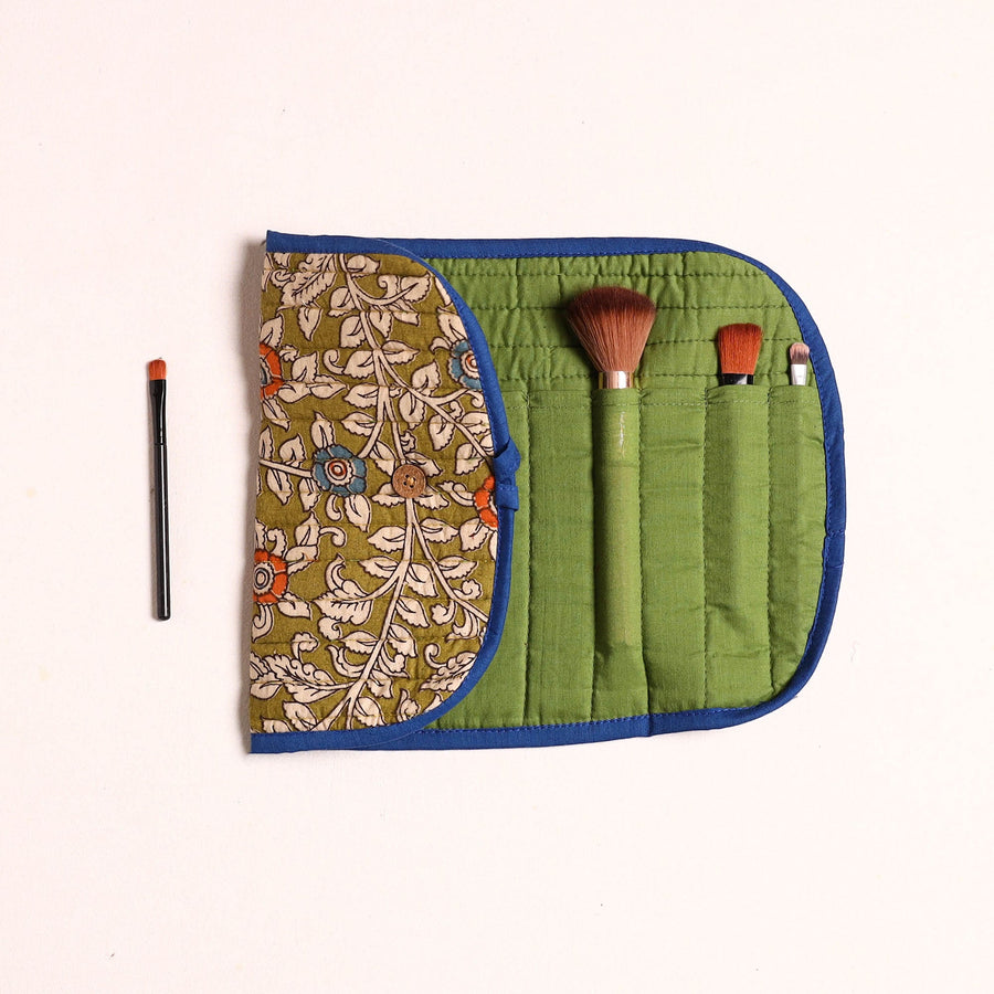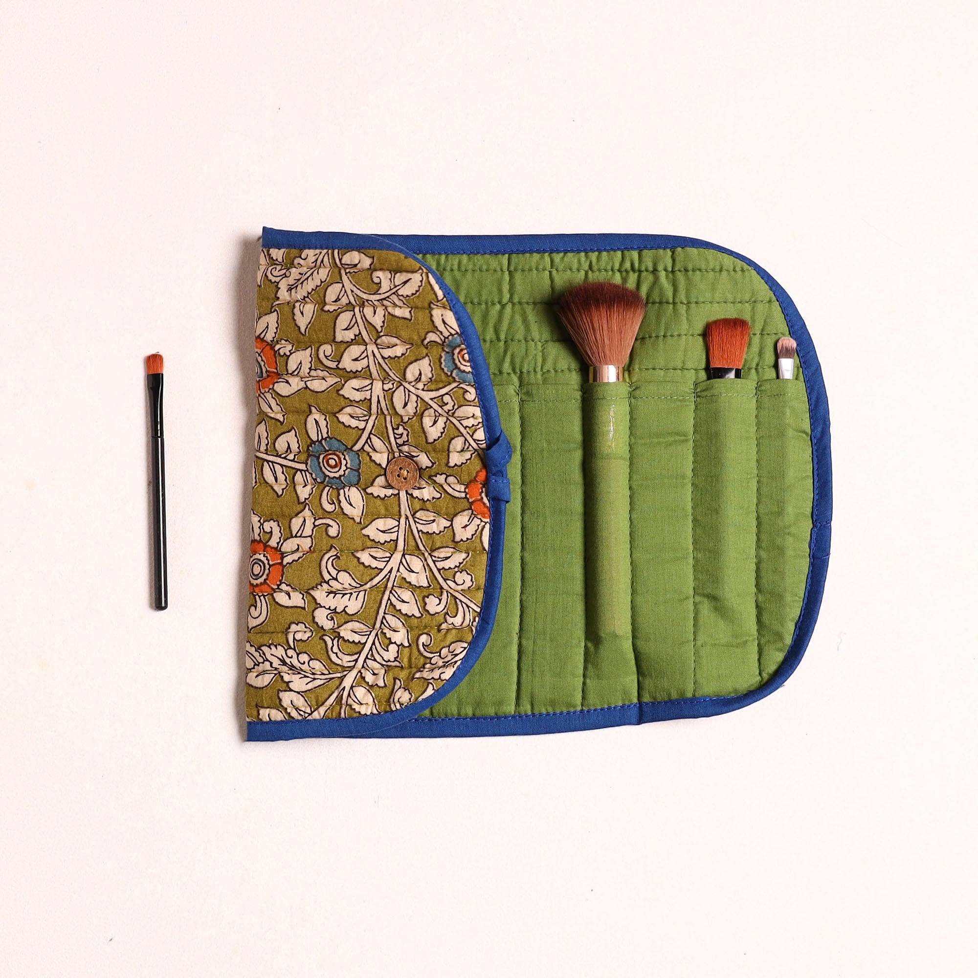 Handcrafted multipurpose segmented make-up brush wrap pouch or storage organizer made from cotton fabrics and foam, textured with handmade textiles from India. Boasting one large and five small pockets, it ensures secure and organized storage for your brushes.