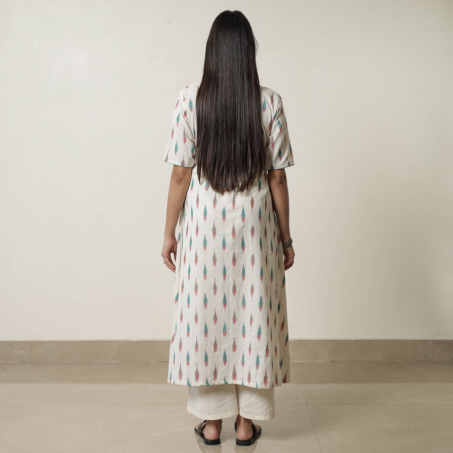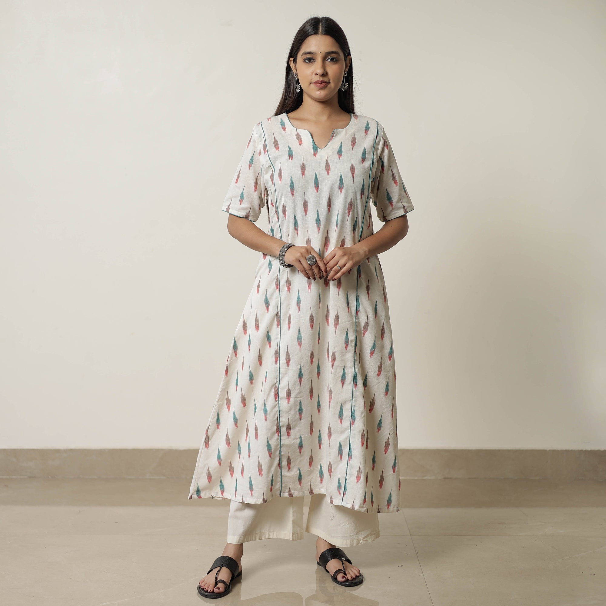 Experience the beauty of Indian ikat with this pochampally ikat weave handloom cotton a-line kurta. Crafted from high-quality cotton, it offers comfort and breathability all day. The vibrant ikat patterns in beautiful colors make it a standout piece. The kurta also features a convenient one-side pocket, perfect for carrying small essentials.