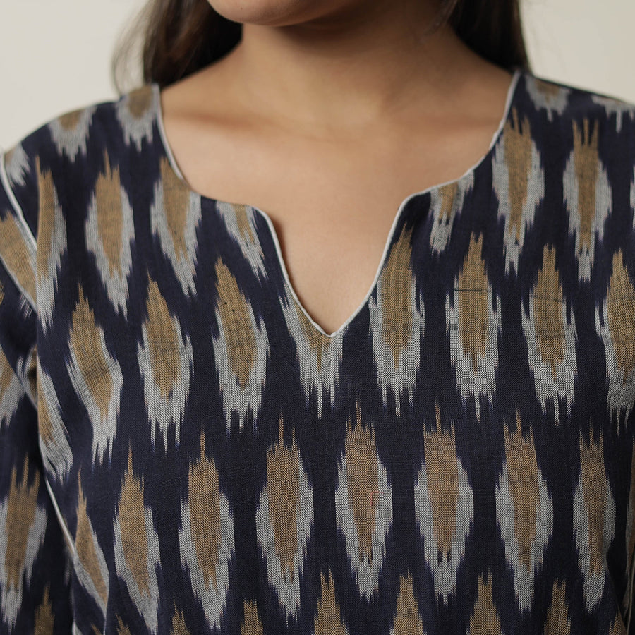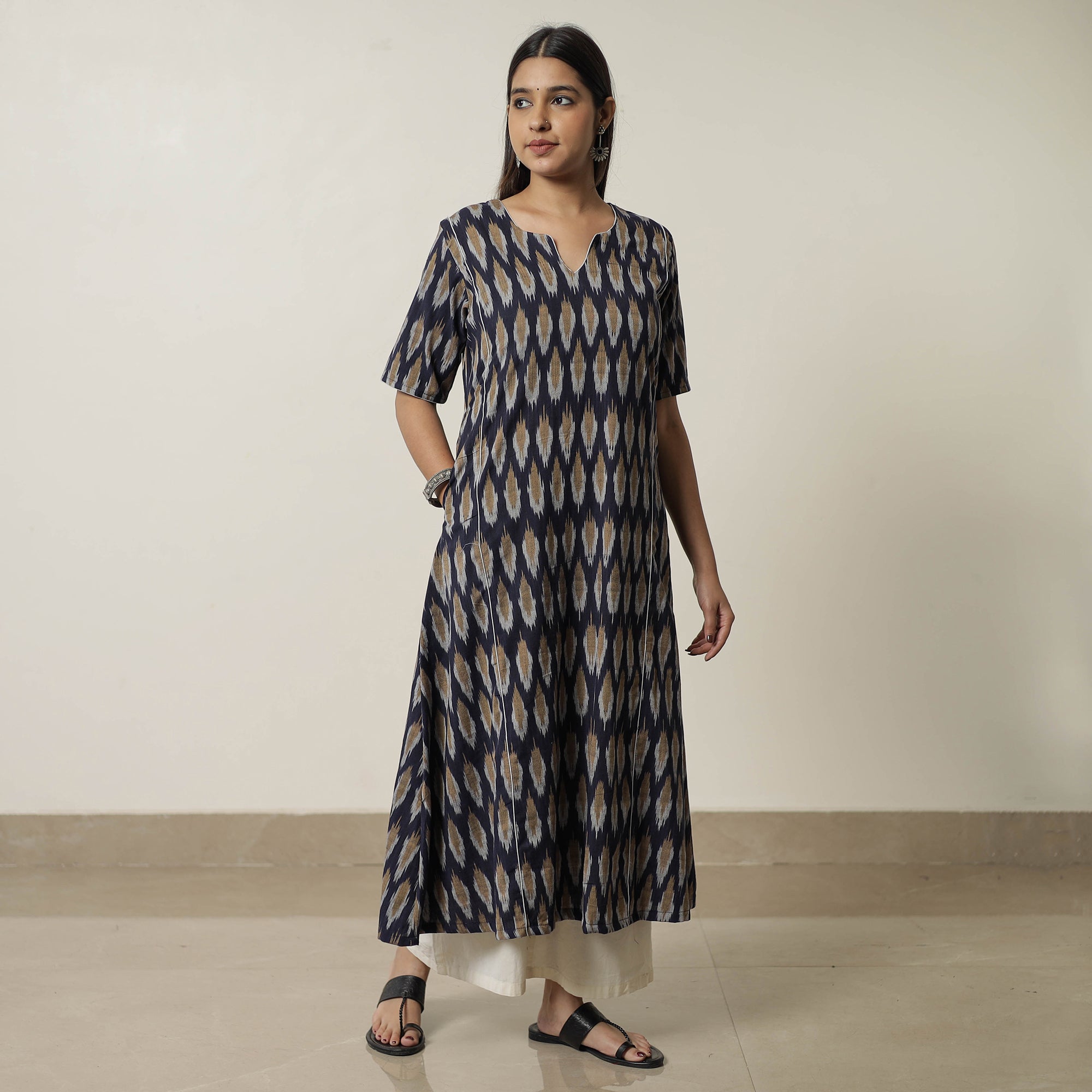 Experience the beauty of Indian ikat with this deep blue pochampally ikat weave handloom cotton a-line kurta. Crafted from high-quality cotton, it offers comfort and breathability all day. The vibrant ikat patterns in beautiful colors make it a standout piece. The kurta also features a convenient one-side pocket, perfect for carrying small essentials.