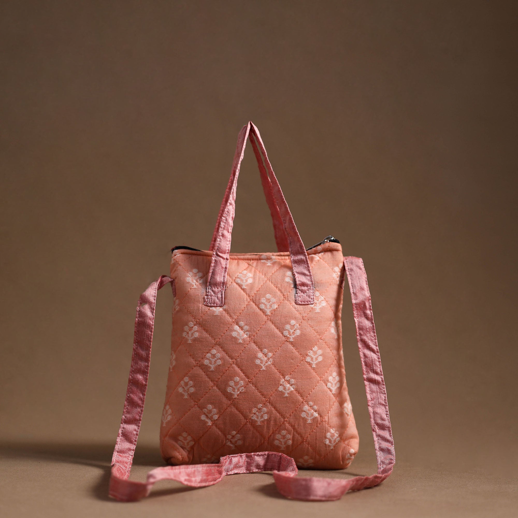 Peach handcrafted quilted banarasi silk sling bag by Noori Bazar. This sling bag is made from banarasi silk cotton fabric. This sling bag boasts four convenient pockets, providing ample space for your essentials. The foam layer lining ensures durability and protection.
