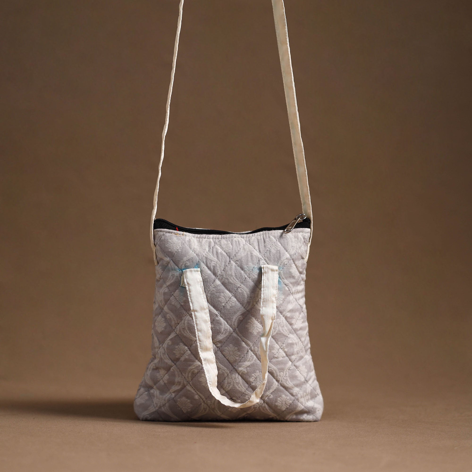 Grey handcrafted quilted banarasi silk sling bag by Noori Bazar. This sling bag is made from banarasi silk cotton fabric. This sling bag boasts four convenient pockets, providing ample space for your essentials. The foam layer lining ensures durability and protection.