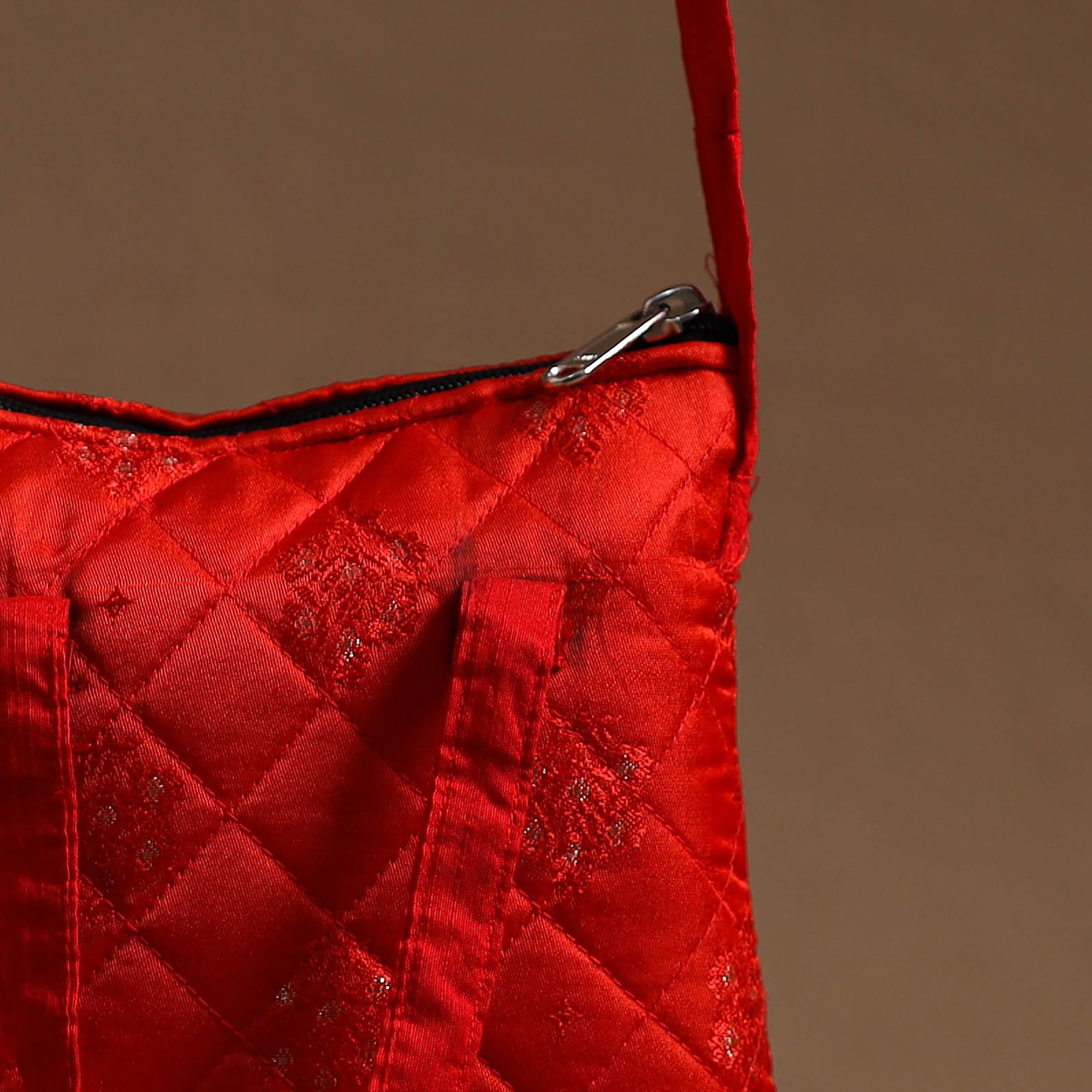 Red handcrafted quilted banarasi silk sling bag by Noori Bazar. This sling bag is made from banarasi silk cotton fabric. This sling bag boasts four convenient pockets, providing ample space for your essentials. The foam layer lining ensures durability and protection.
