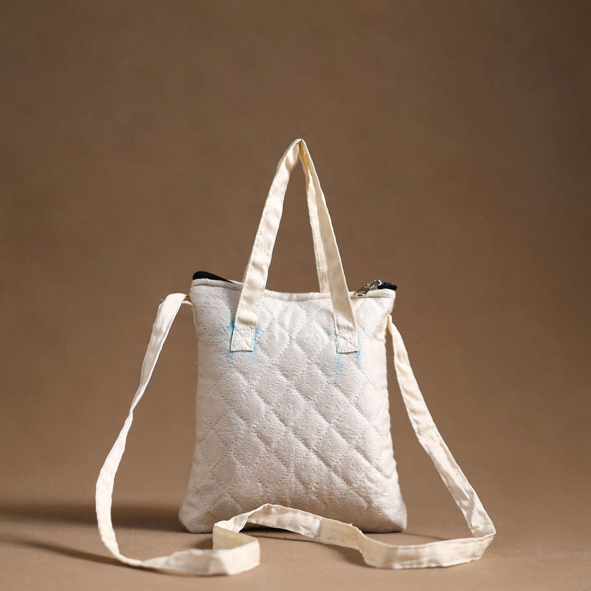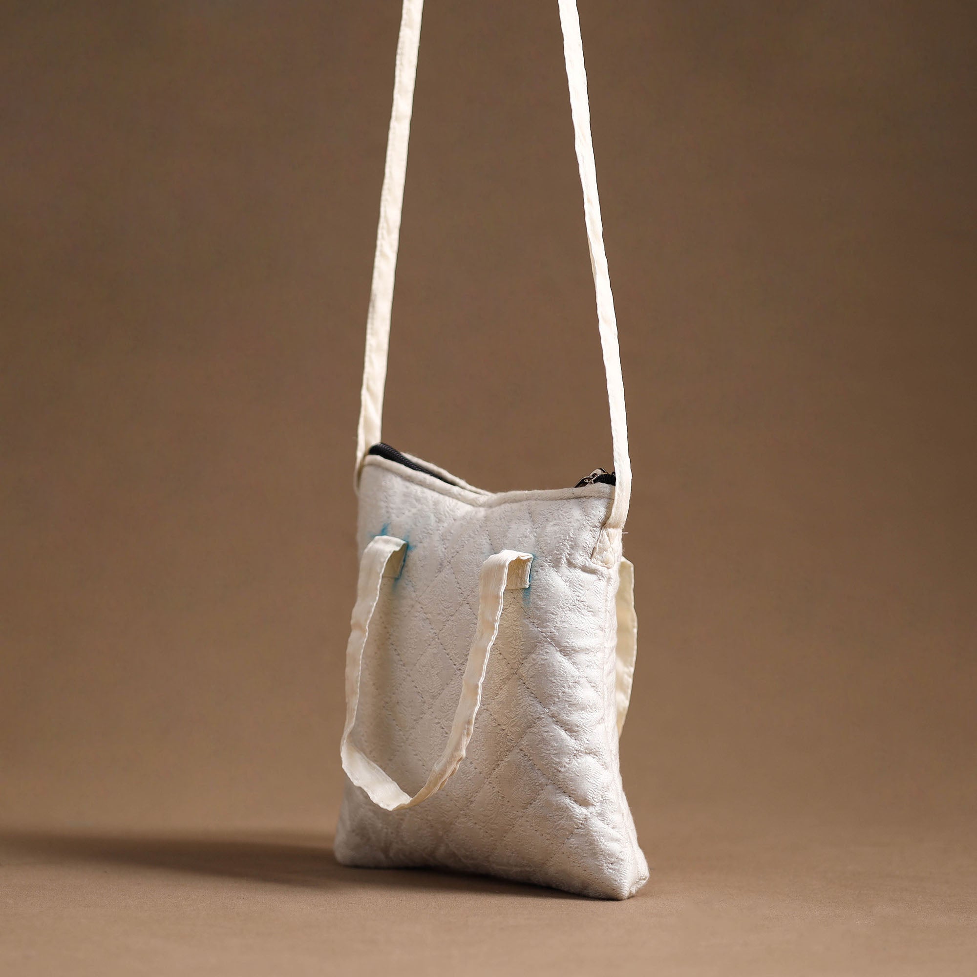 White handcrafted quilted banarasi silk sling bag by Noori Bazar. This sling bag is made from banarasi silk cotton fabric. This sling bag boasts four convenient pockets, providing ample space for your essentials. The foam layer lining ensures durability and protection.