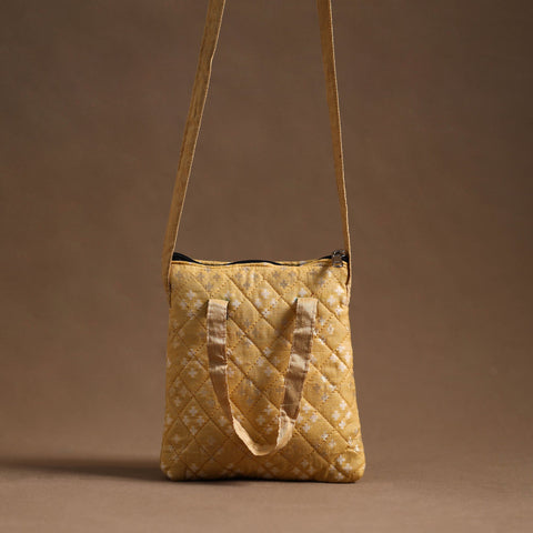 Beige handcrafted quilted banarasi silk sling bag by Noori Bazar. This sling bag is made from banarasi silk cotton fabric. This sling bag boasts four convenient pockets, providing ample space for your essentials. The foam layer lining ensures durability and protection.