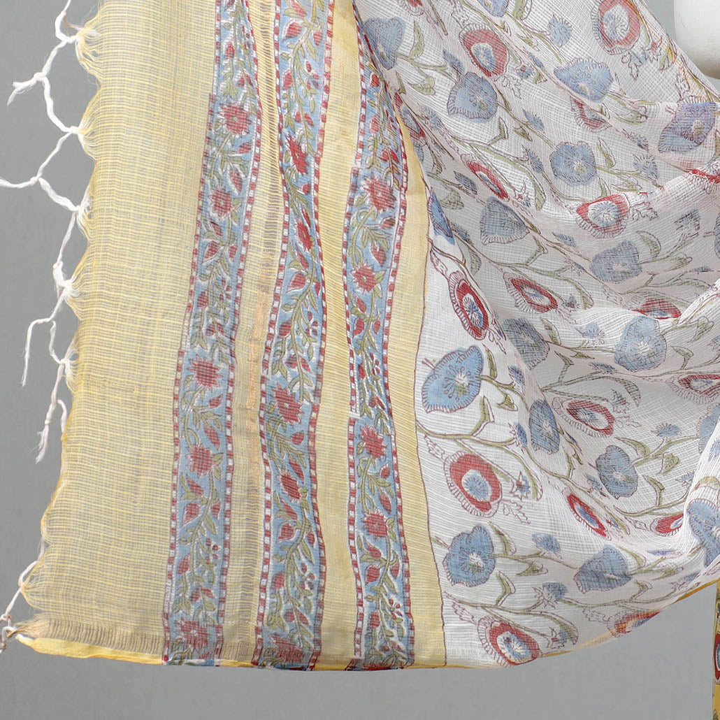 Elevate your style with this exquisite 3-piece sanganeri block printed cotton suit material with a kota doria cotton zari border dupatta. This suit material has been created using the technique of hand block printing originating from Sanganer, a village in the southern part of Jaipur, Rajasthan. This suit material uses azo-free dyes, making it safe and non-harmful for skin.