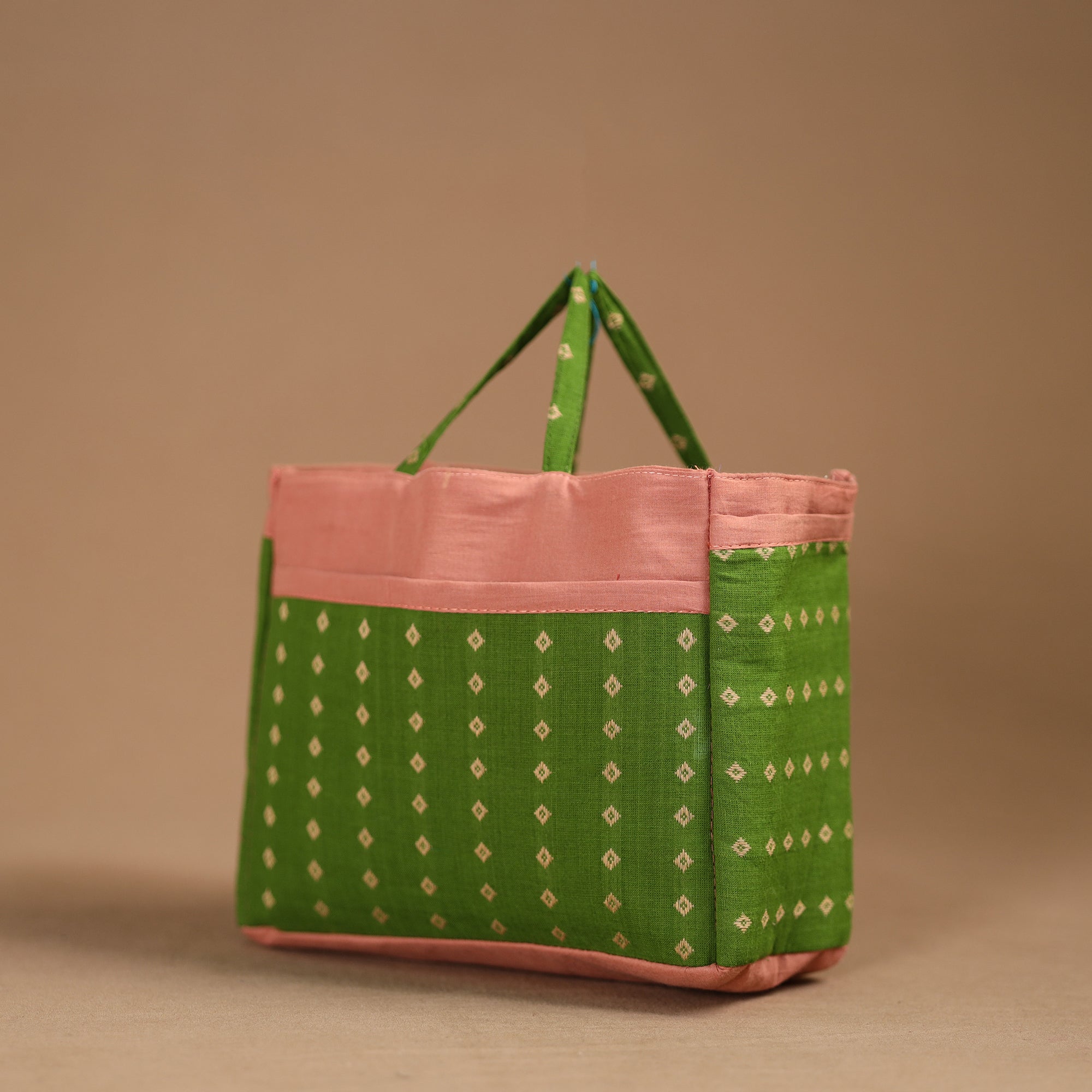 Handmade multipurpose cosmetic/toiletry bag. This bag is crafted from cotton fabric with a spill-proof plastic layer inside, textured with handmade textiles from India. It has two simple pockets, one zipper pocket inside, and four convenient pockets on the outside.