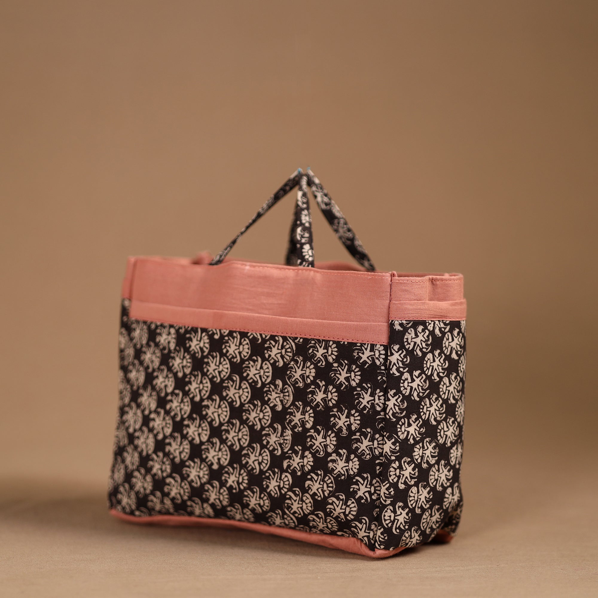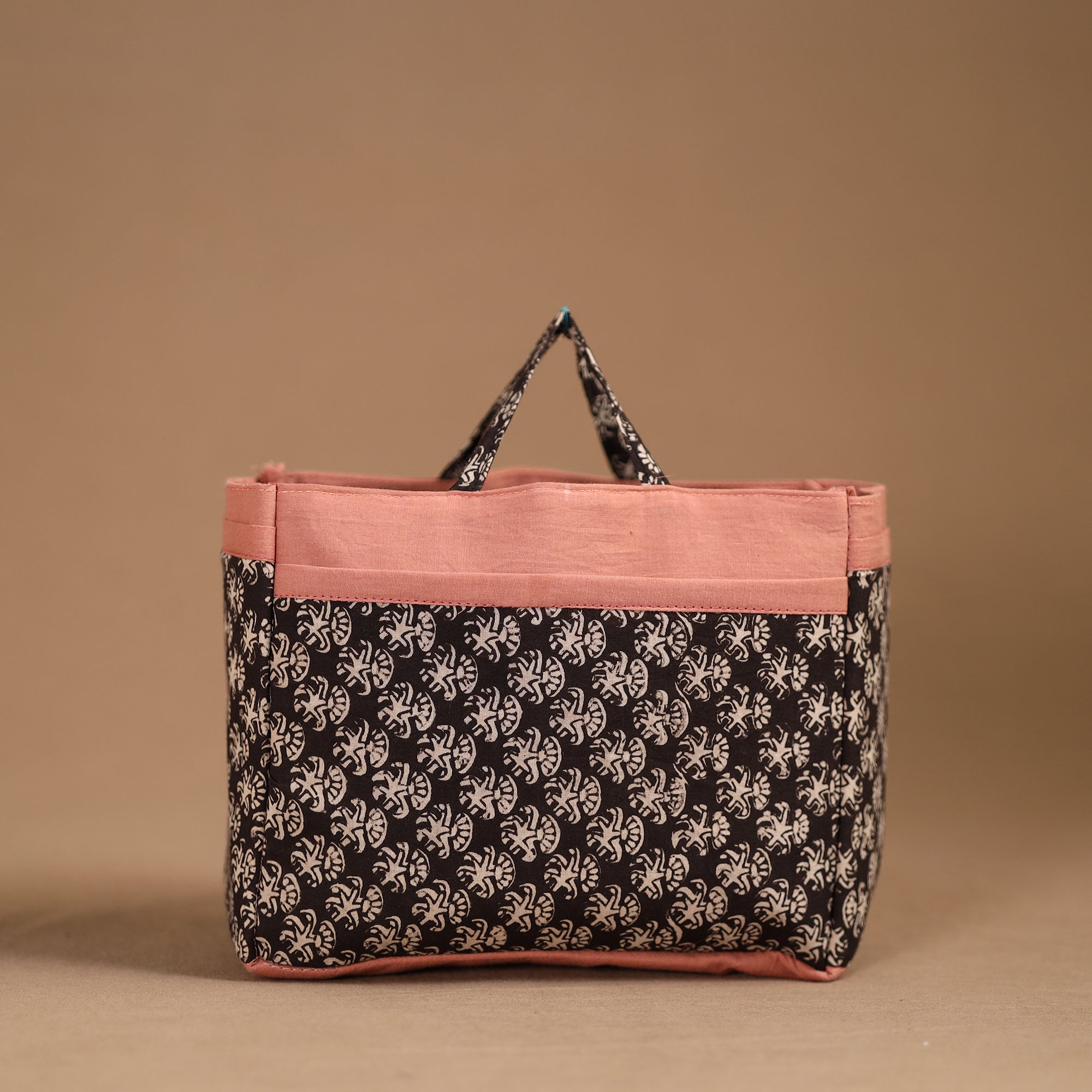 Handmade multipurpose cosmetic/toiletry bag. This bag is crafted from cotton fabric with a spill-proof plastic layer inside, textured with handmade textiles from India. It has two simple pockets, one zipper pocket inside, and four convenient pockets on the outside.